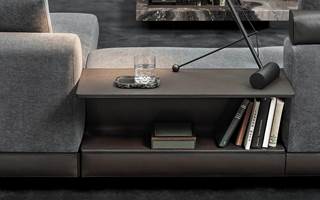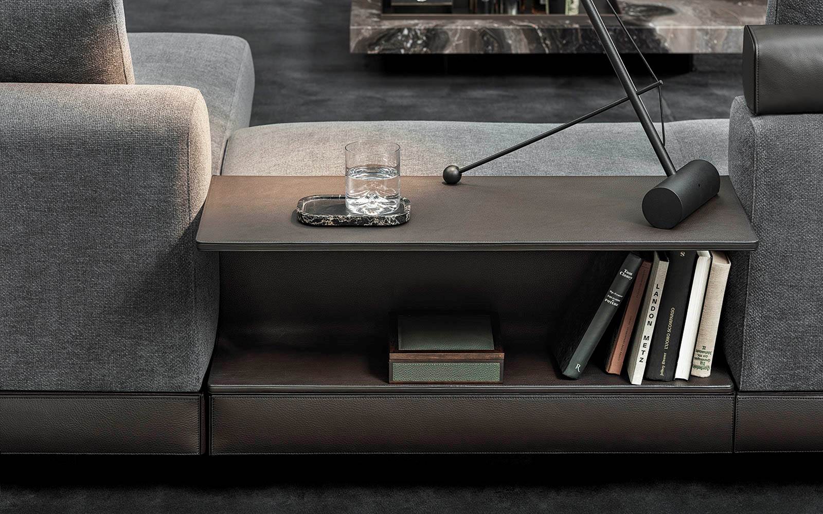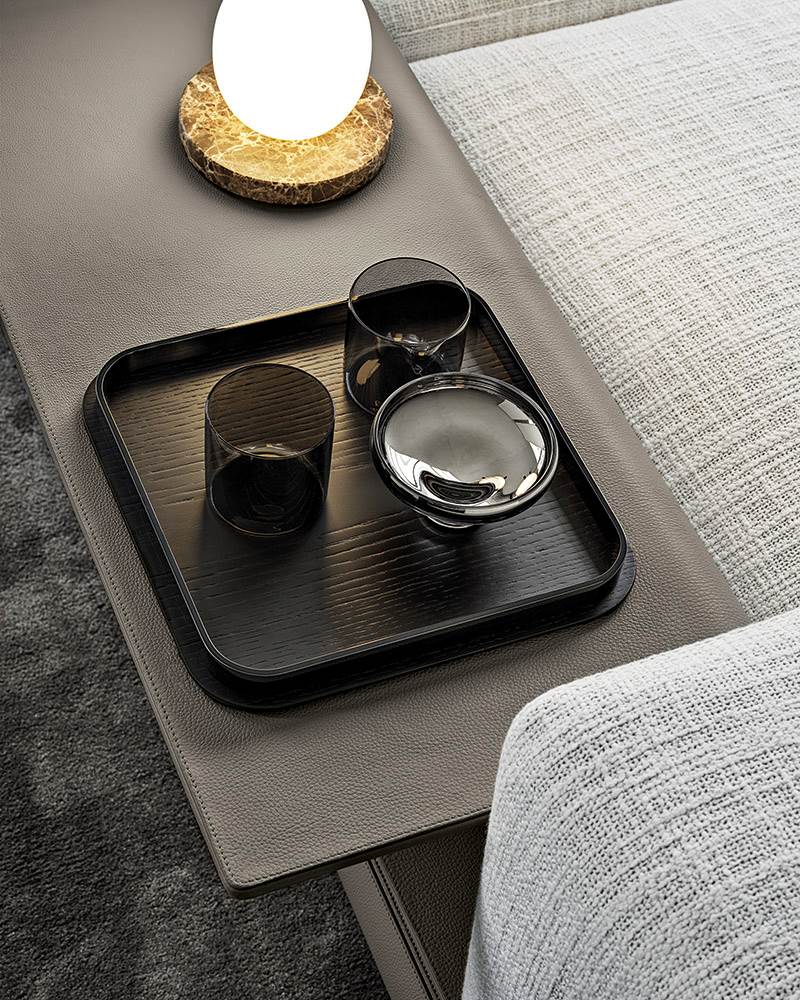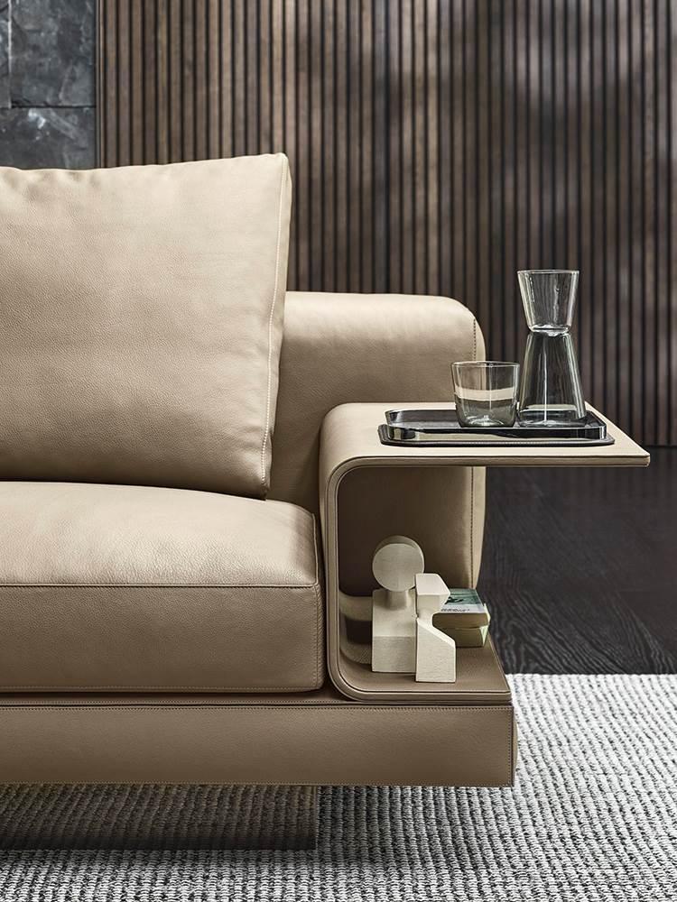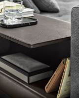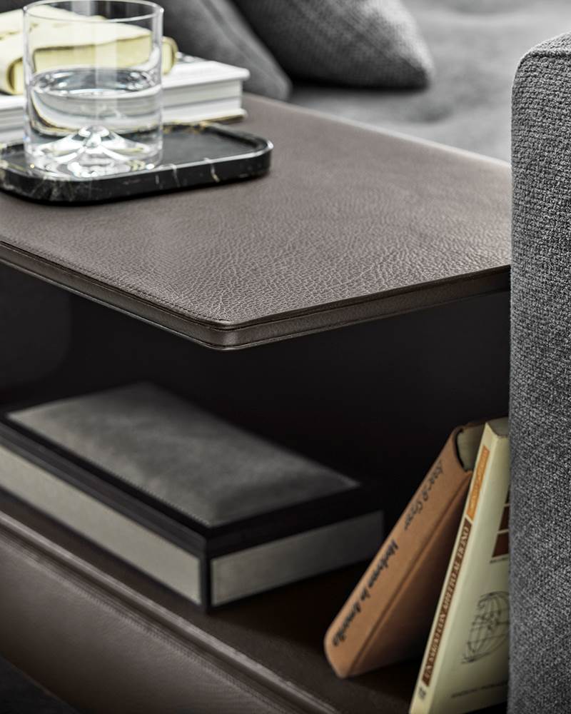 Die Ablageflächen Flap greifen das Streifendesign des Sofaunterbaus auf und sind ein echtes Plus dieses Programms, da sie eine raffinierte Ablagelösung darstellen, die zudem wie ein Behälter Platz für Objekte bieten kann. Bezogen mit Leder, oder aus Eschenholz im Farbton Mokka, treten sie in einen harmonischen Dialog mit den Texturen des Bezugs.