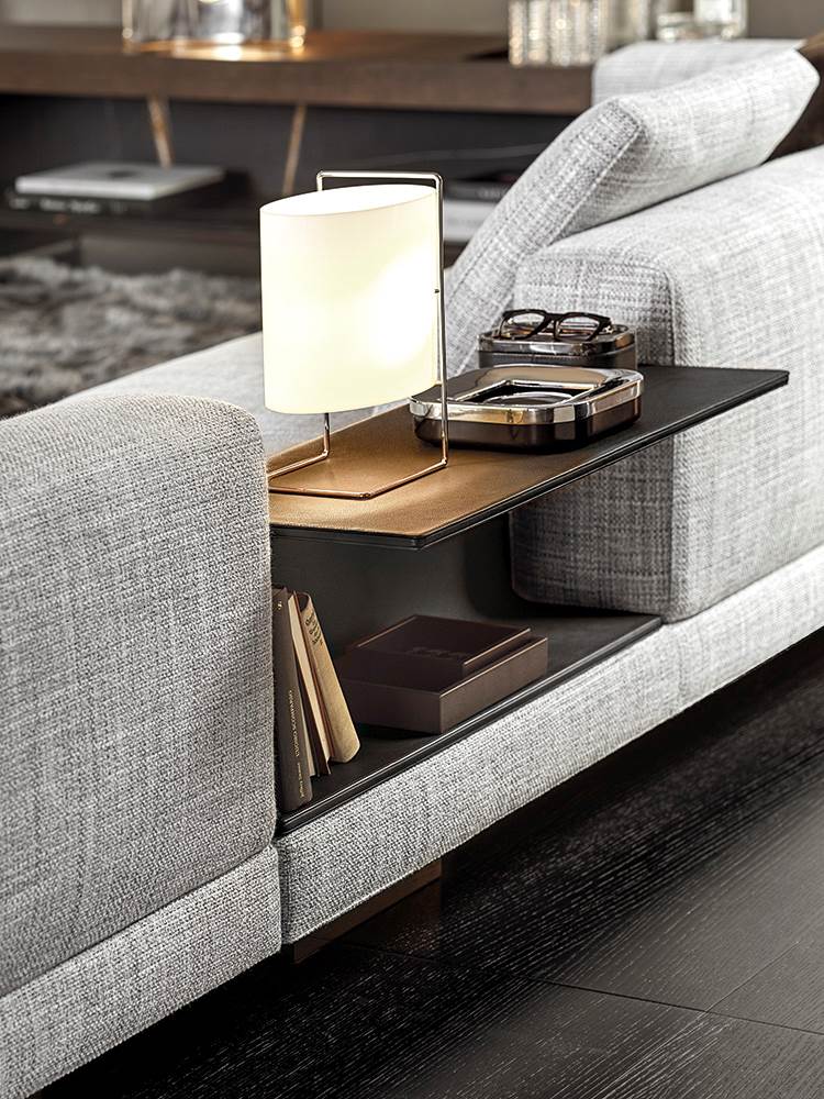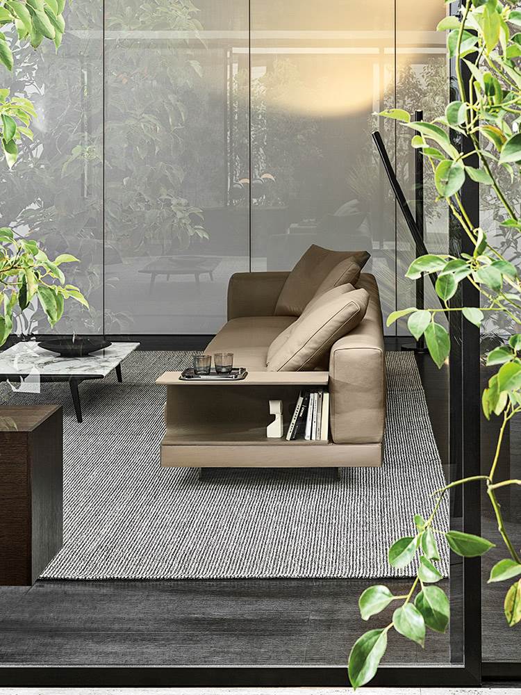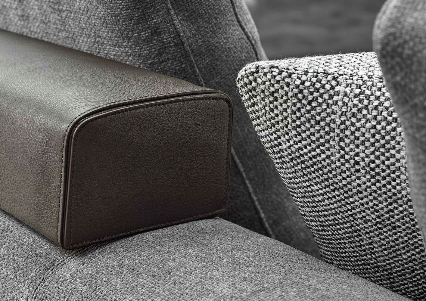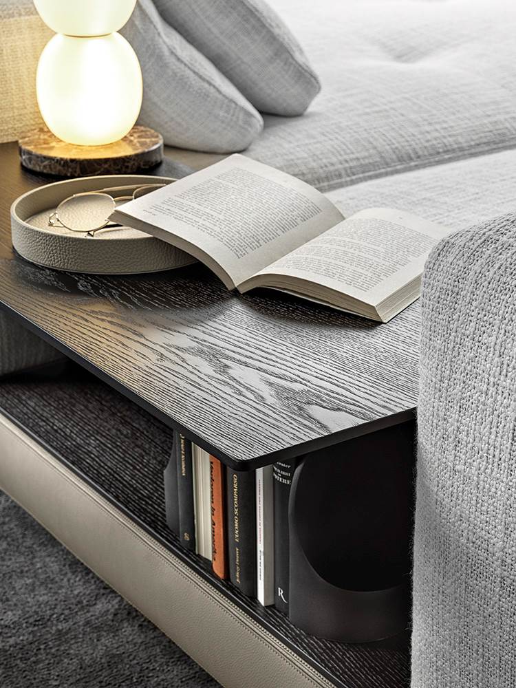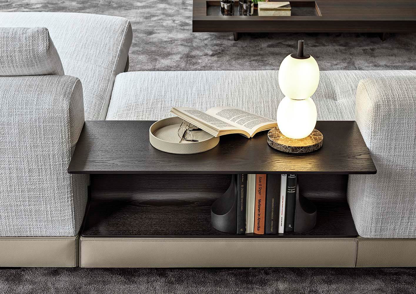 Die Ablageflächen Flap greifen das Streifendesign des Sofaunterbaus auf und sind ein echtes Plus dieses Programms, da sie eine raffinierte Ablagelösung darstellen, die zudem wie ein Behälter Platz für Objekte bieten kann. Bezogen mit Leder, oder aus Eschenholz im Farbton Mokka, treten sie in einen harmonischen Dialog mit den Texturen des Bezugs.
