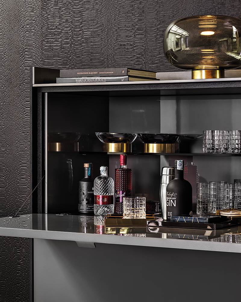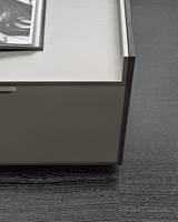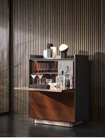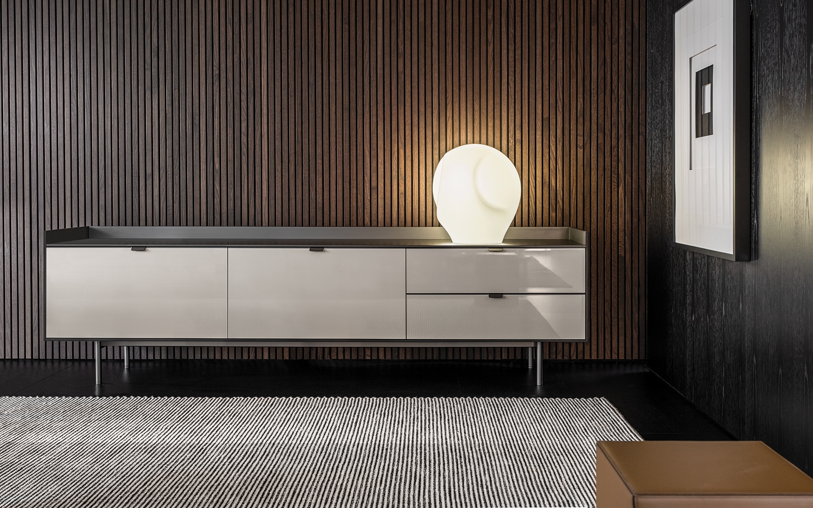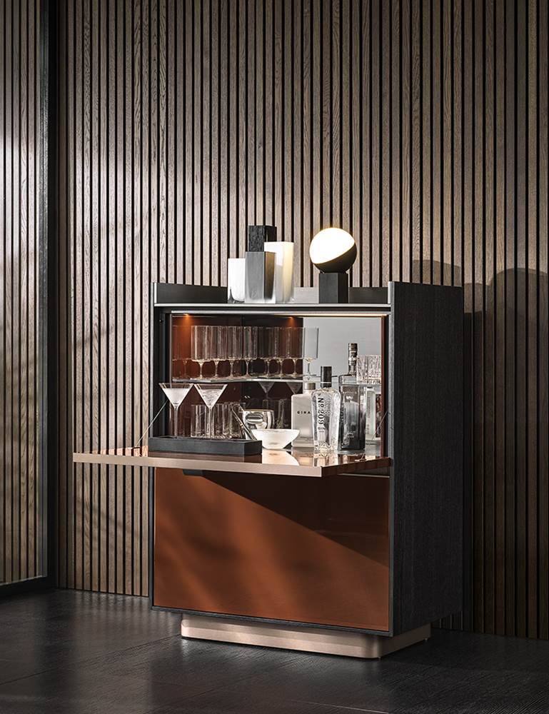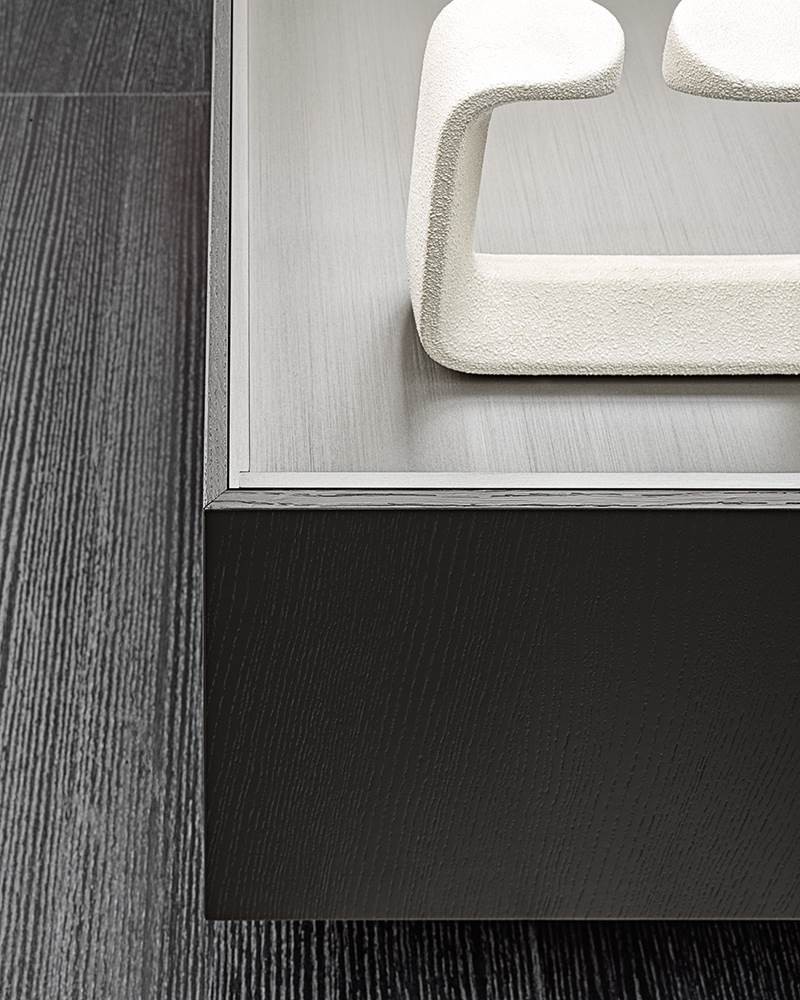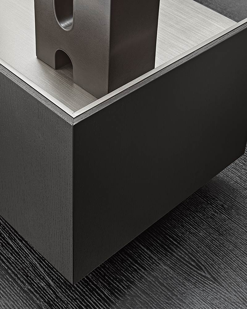 Darrens scheinbar formale Schlichtheit und sein rigoroses rationales Design verbergen ein weitaus komplexeres, artikuliertes Projekt. Der zentrale Korpus aus Eschenholz im Farbton Mokka weist einen an drei Seiten geschlossenen Fachboden aus, der mit satiniertem Aluminiumplatten in der Farbe Malz beschichtet ist und auf einem Sockel in der gleichen Ausführung aufliegt.