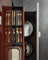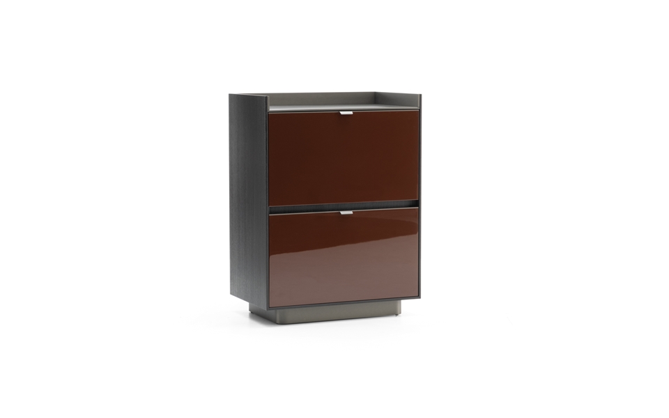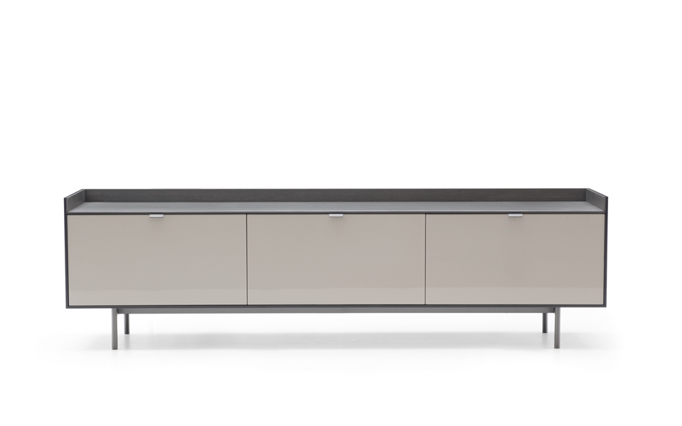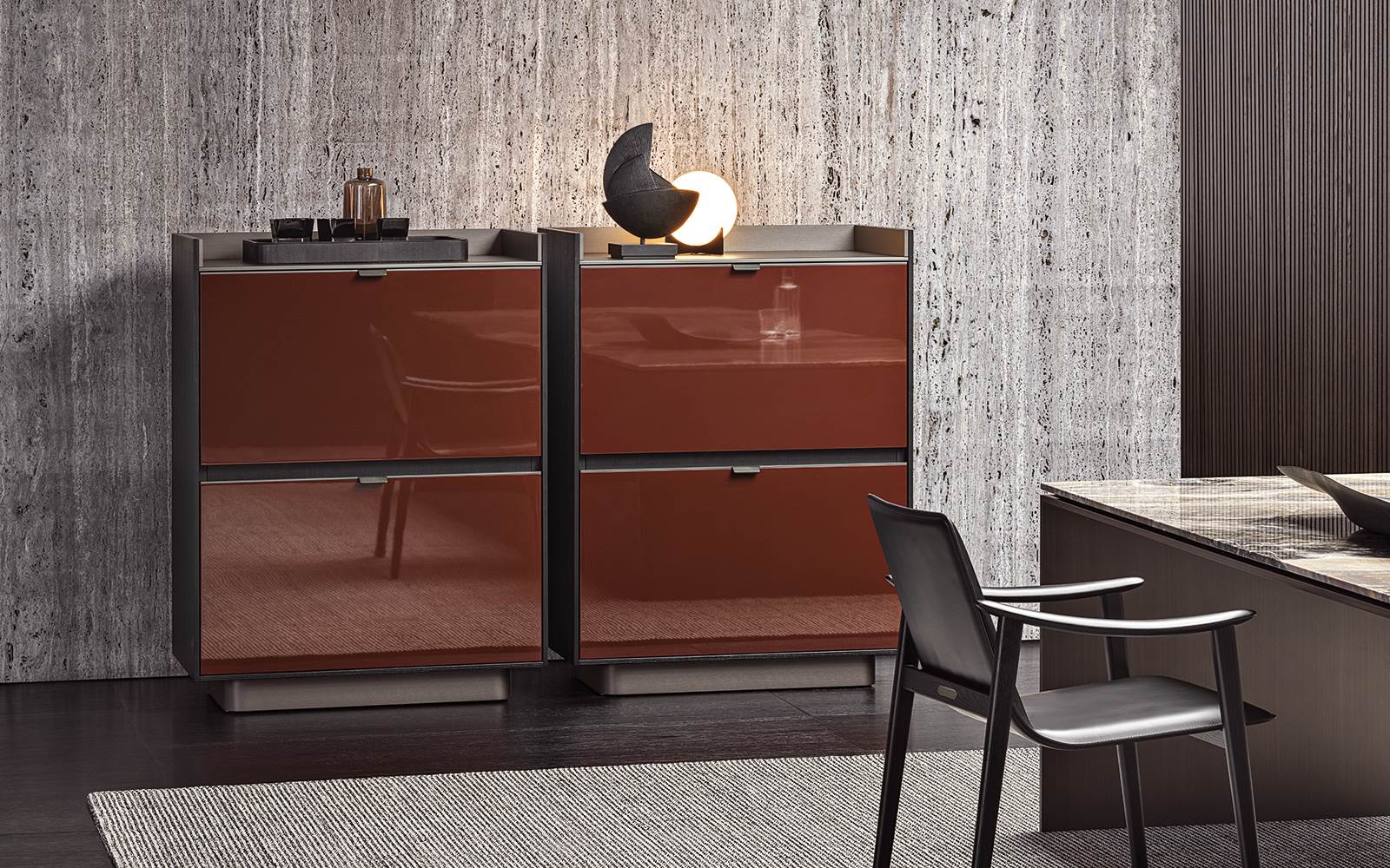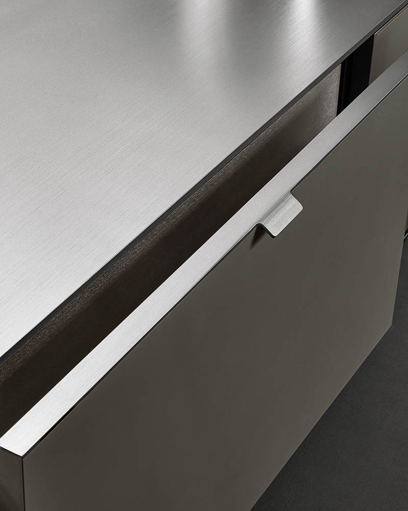 Die in den Farben Ton, Sand und Corten, glänzend lackierten Türen öffnen sich dank eines Griffs, der wie die Oberseite des Möbels aus Metall ist und aus dem Streifen gewonnen wird, der den oberen Rand bildet.
