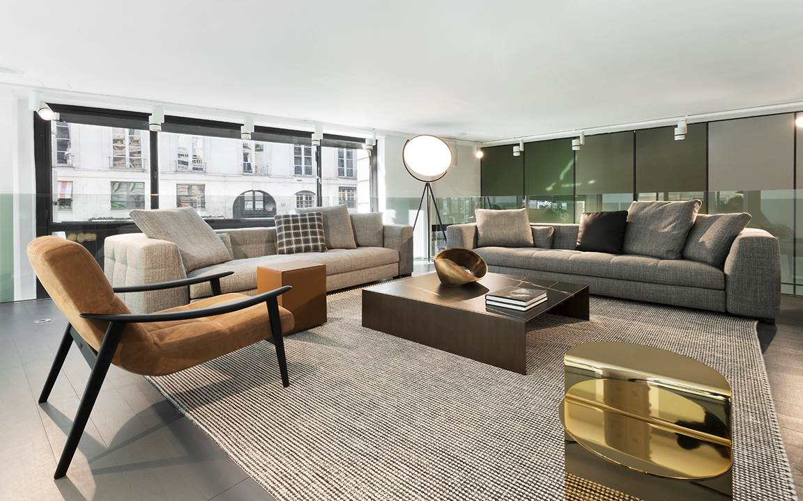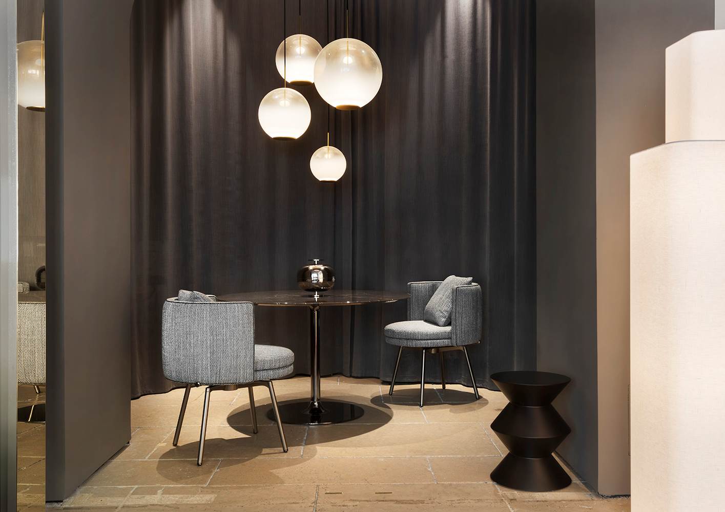 Im exklusiven Schaufenster von Silvera Saint-Germain steht die Familie Torii von Nendo mit zwei Sofas, einem Sessel und einigen Dining-Sesseln im Mittelpunkt und erzeugt die Atmosphäre eines echten ruhigen und behaglichen Wohnambientes. Alle Stücke, die sich perfekt in die Architektur des Raums einfügen, spielen mit den abgerundeten Konturen und werden bereichert durch exklusive Details, die mit der japanischen Tradition verbunden sind, und erlesene Bezüge, die den Haute-Couture-Geist von Minotti unterstreichen. Ergänzt wird die intime und elegante Atmosphäre durch einen Behälter und einen Beistelltisch Boteco.