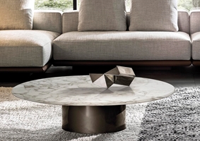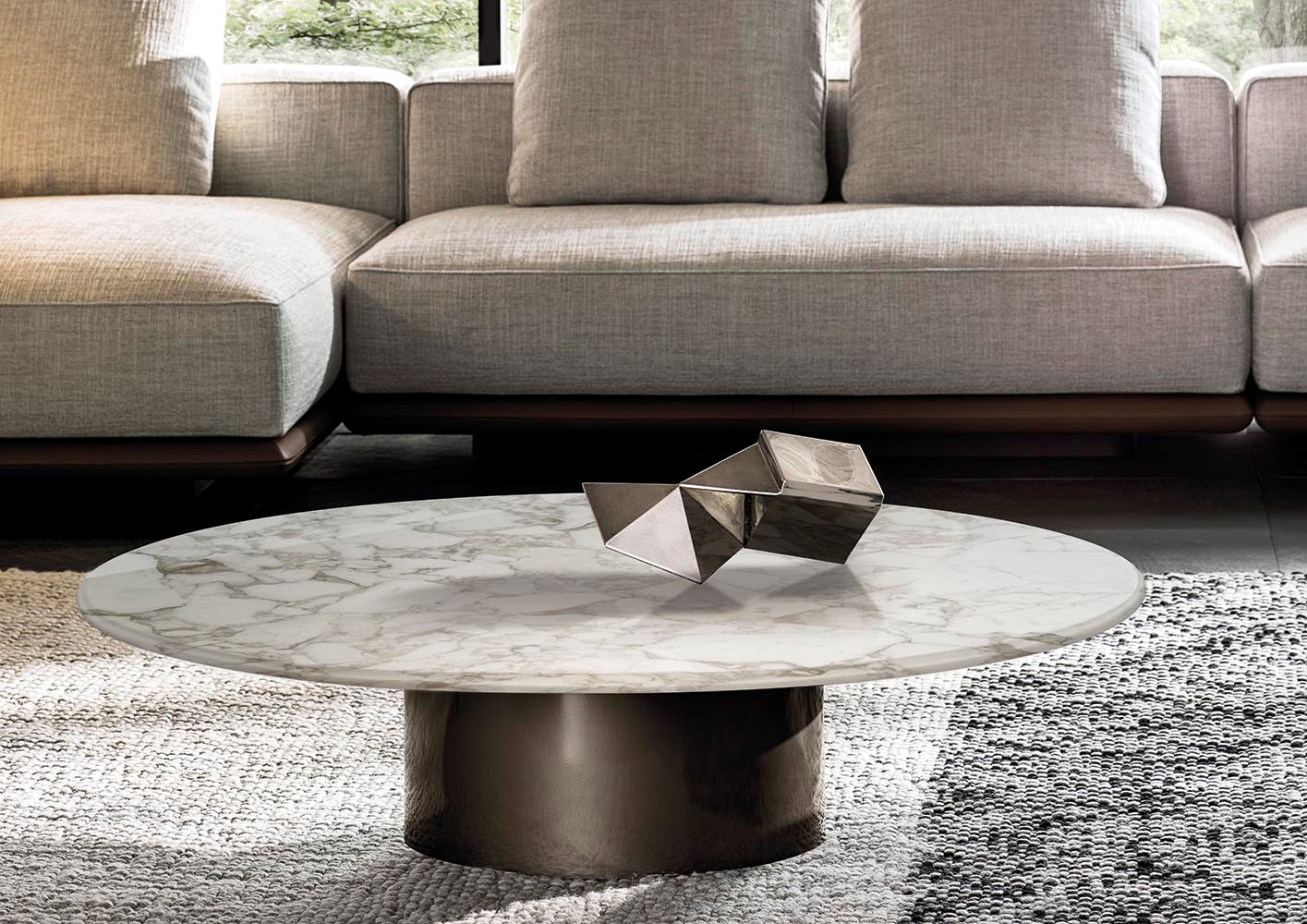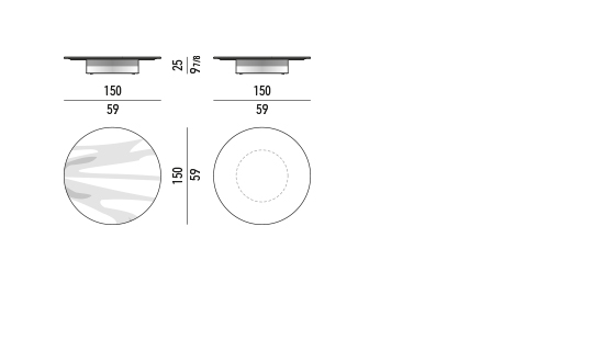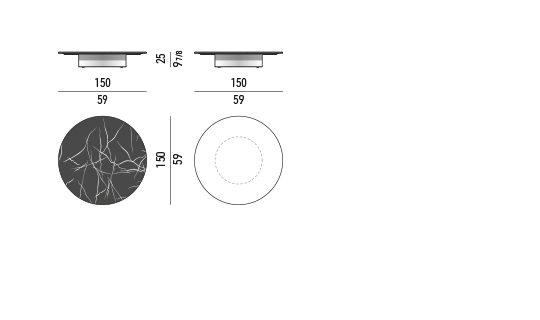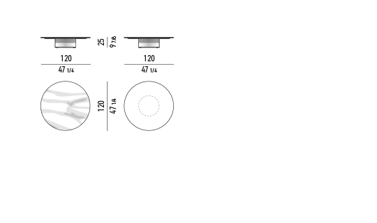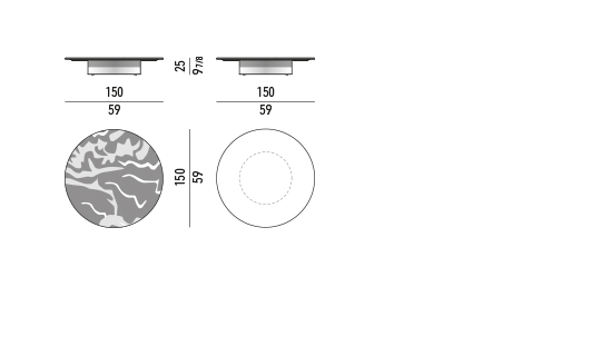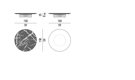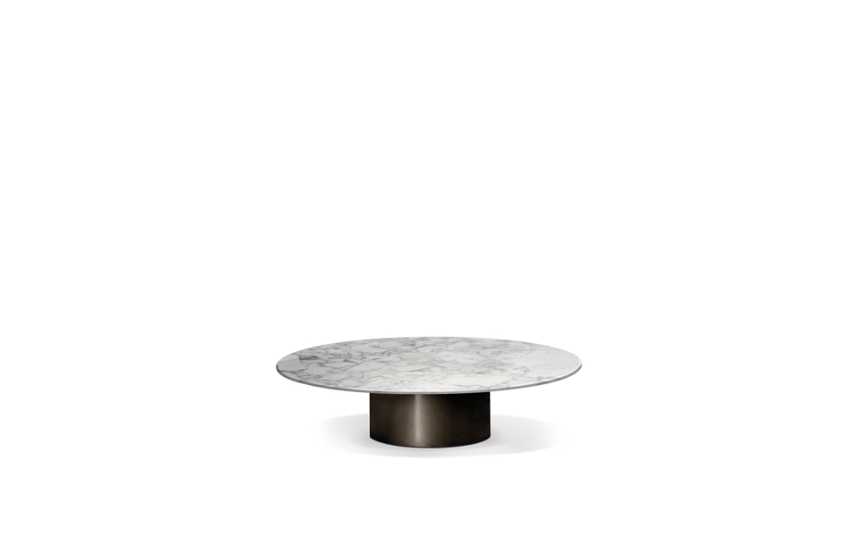 Doyle ist in drei verschiedenen Größen erhältlich, mit einem Durchmesser von 120 cm und einer Höhe von 25 oder 30 cm oder einem Durchmesser von 150 cm und einer Höhe von 25 cm. Sein zylindrischer Sockel ist aus poliertem, bronzefarben lackiertem Metall. Dank seiner klaren und essenziellen Linien ist dieses Möbelstück das ideale Passepartout, um jeder Wohnumgebung einen Hauch von absoluter Einzigartigkeit zu verleihen.
