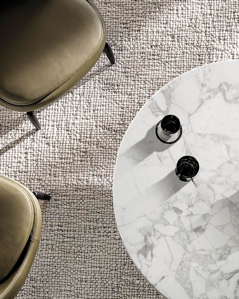 Inspiriert wurde der Beistelltisch Doyle von der Lounge-Atmosphäre des Mid Century. Er besteht aus einer 20 mm starken, runden Platte mit abgerundeter Kante aus Calacatta-Marmor, Belvedere-Granit mit gebürstetem Finish und Nero Marquina- und Portoro-Marmor.