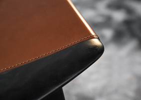 Eine Variante des Projekts ist die Version Fynn Saddle-Hide, bei der Sitzfläche und Rückenlehne als ein einzelnes Element aus Kernleder geformt sind. Der Sessel und der kleine Lounge Sessel haben ein gepolstertes Rückenkissen, das beim Dining Sessel optional ist.