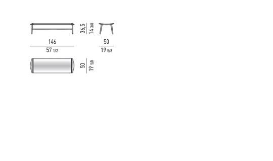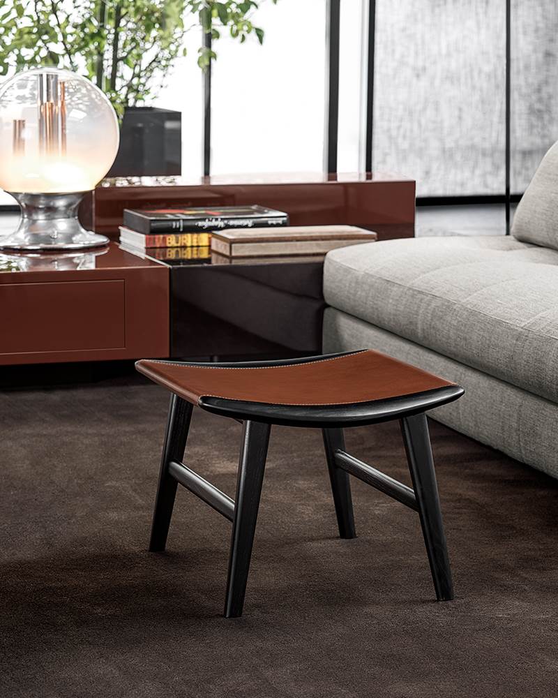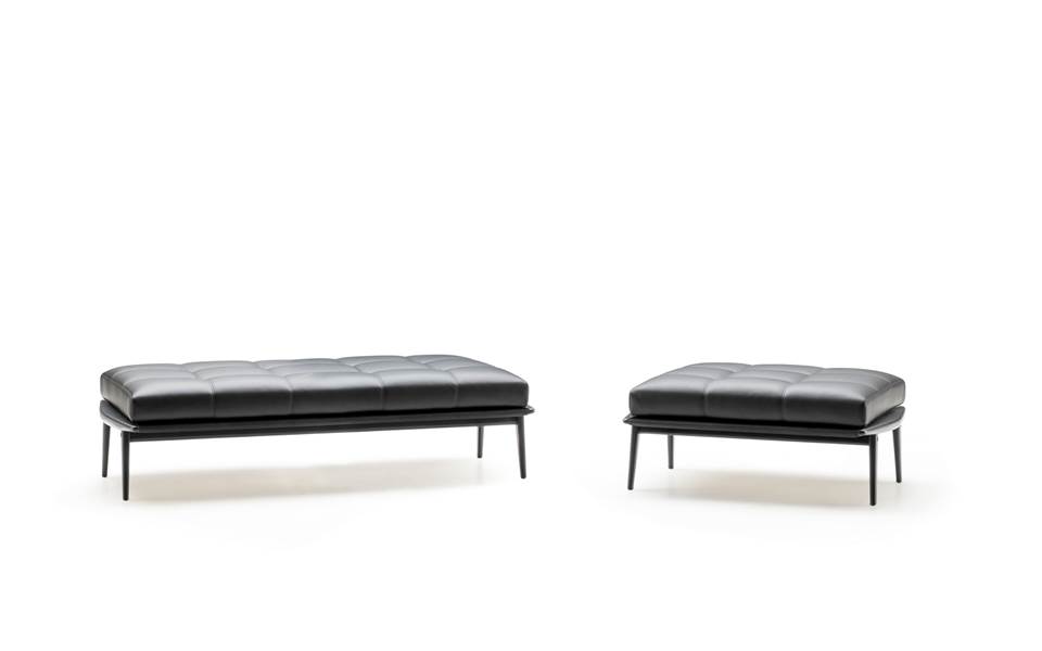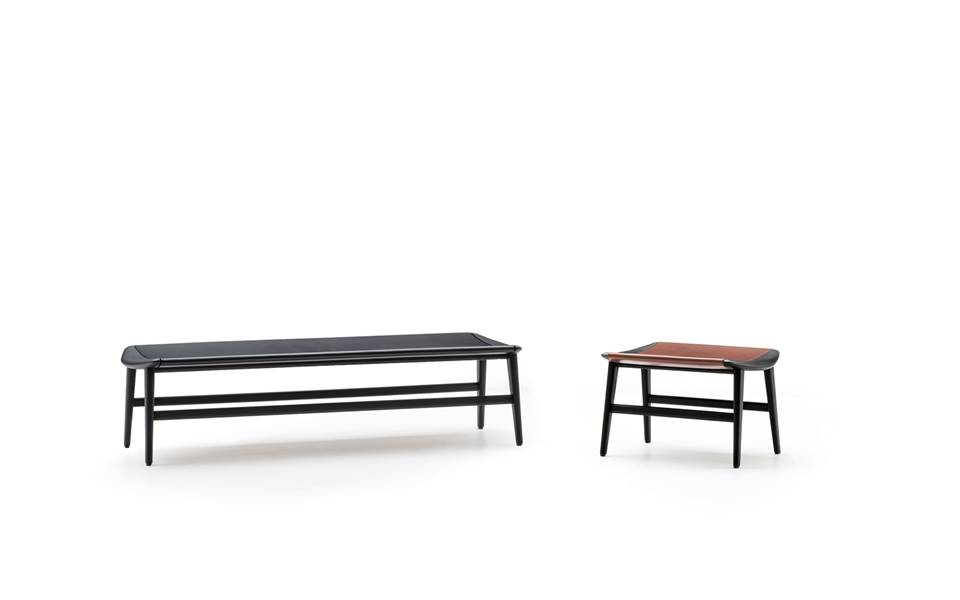 Die Sitzpolster-Familie Fynn wird durch einen Hocker und einige Bänke in unterschiedlichen Größen ergänzt, alle mit Kissen außer den Bänken in der Version Saddle-Hide, welche eine Struktur mit leicht hohler Fläche aufweisen, die von einem Kernlederbezug wie ein edles Leder eingehüllt wird.