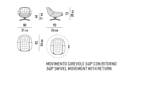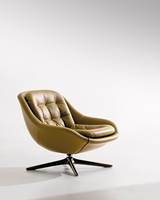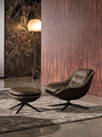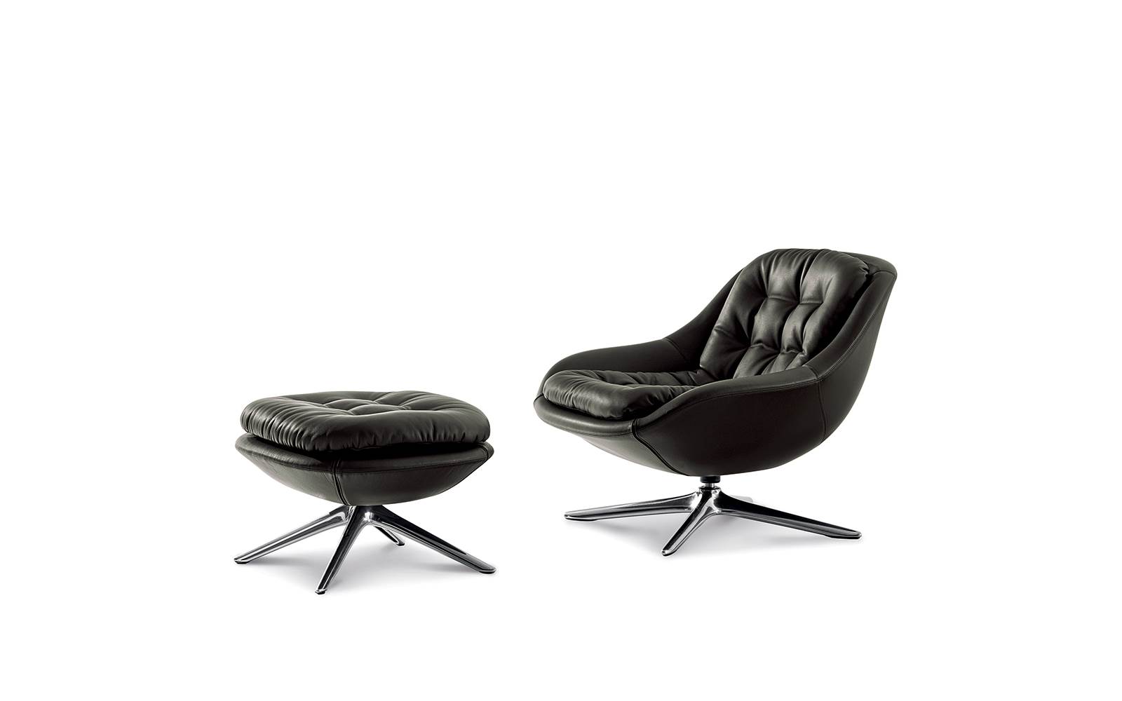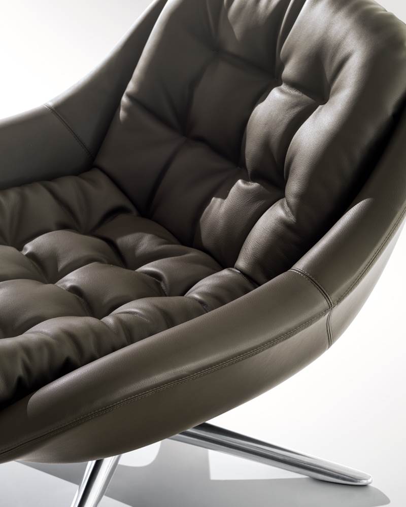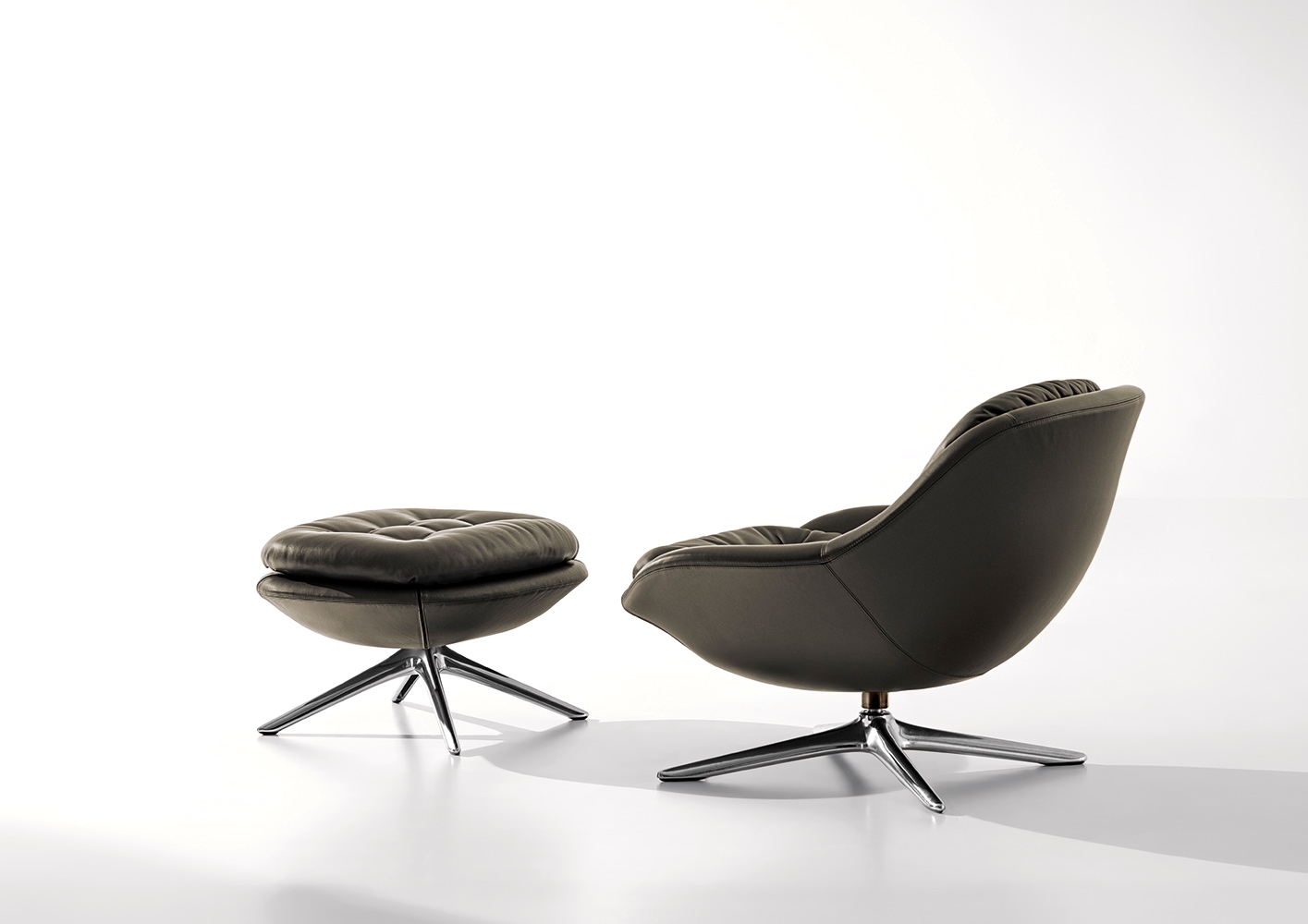 Er ist sanft geschwungen und anschmiegsam, wird von einem Drehgestell mit vier Speichen aus Aluminium getragen und präsentiert sich als solides Gehäuse, in dem ein matratzenartiges Kissen mit den für das Savoir-faire typischen Steppnähten der Manufaktur Minotti liegt, das im Gegensatz zur dynamisch wirkenden Schale unmittelbaren visuellen Komfort verspricht.