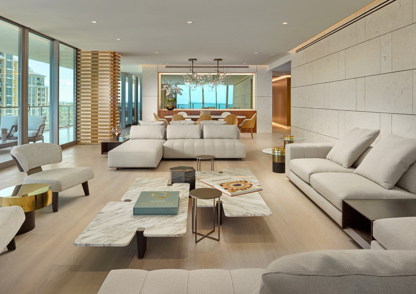 Für den geräumigen, lichtvollen Wohnraum wurden zum Beispiel Kompositionen des Sitzprogramms Freeman gewählt, mit einem raffinierten, ecrufarbigen Stoffbezug, in perfekter Harmonie mit den Naturtönen, die in der ganzen Wohnung vorherrschen. Abgerundet wird der Raum mit den Sesseln Reeves und Beistelltischen Jacob mit Tischplatten aus kostbarem Calacatta Marmor, sowie den kleinen Tischen Duchamp “Bronze” und Benson.