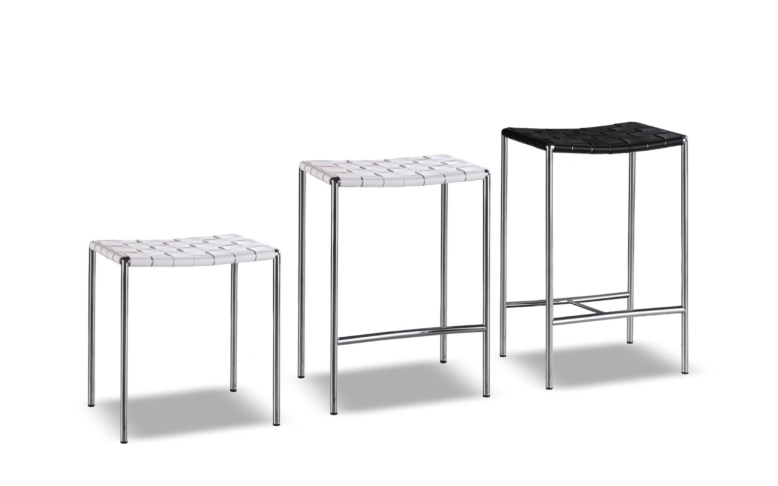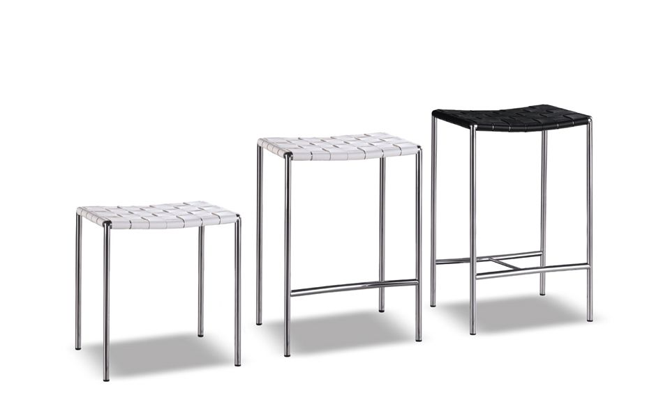 Der Hocker Klasen ist in drei Höhen erhältlich - 45, 65 und 75 cm – mit einer verchromten oder schwarz lackierten Struktur und einem Sitz aus Ledergeflecht in den Farben Weiß, Nature, Dunkelbraun und Schwarz. Mit seinem geringen Format lässt sich der Hocker Klasen ebenso leicht in private Wohn-räume, wie auch in Gemeinschaftsräume einfügen.