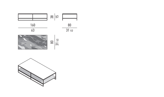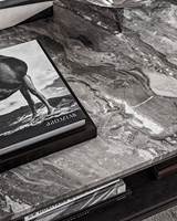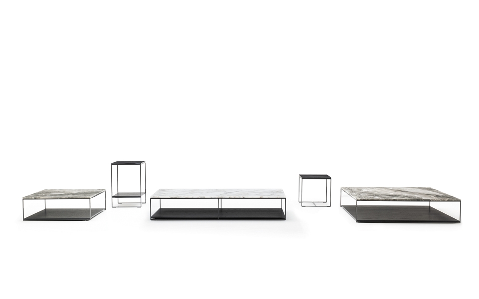 Charakteristisch für die Familie der Couchtische Liam ist das luftige Gestell aus Stahlrohr mit 1 cm großem quadratischen Querschnitt, das dem Volumen mit seinem glänzenden Zinn-Finish Leichtigkeit verleiht. Auf dem Gestell ruht eine Tischplatte aus Calacatta-Marmor, Grigio Orobico Marmor, schwarzer Glaspaste oder gebürsteter Eiche Farbe Moka lackiert, und in einigen Modellen eine niedrigere Holzplatte, ebenfalls in der Ausführung gebürstete Eiche Farbe Moka lackiert, für Bücher, Zeitschriften und Objekte.