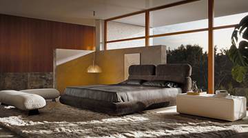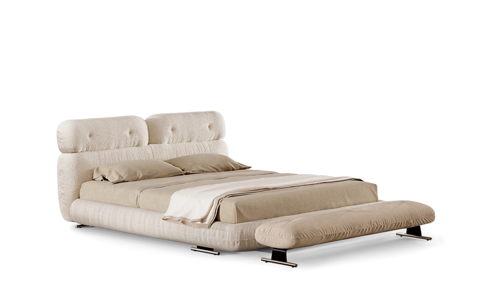 Die für die Sitzmöbel Libra charakteristische Anlehnung an die Ästhetik der 70er-Jahre prägt auch das Libra Bed, ein Projekt für den Schlafbereich, bei dem sich die gleiche Überlagerung von runden Sitz-, Rücken- und Kopfstützenvolumen und die sorgfältigen handwerklichen Detailarbeiten der Polsterung wiederfinden und seine raffinierte Verarbeitung unterstreichen. Die Besonderheiten dieses Bettes, dessen Untergestell aus einem Federkern-Bettrahmen besteht, sind einerseits das Profil, das die Raffungen an der Außenkante betont und es besonders komfortabel macht, und andererseits die aus Metallrohr gefertigten Standfüße.