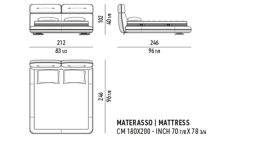 Selbsttragender, einteiliger Bettrahmen aus starkem Sperrholz. Der Bettrahmen ist für die Aufnahme von Taschenfederkernen ausgelegt, die an der Oberfläche mit einer Schicht aus hochelastischem Polyurethanschaum (CF-frei) abgedeckt sind, die mit einem gelochten Funktionsgewebe bezogen ist, das die Atmungsaktivität des Gestells erhöht. Eine perforierte Sperrholzplatte an der Basis der Federn erleichtert die Belüftung. Kopfteil (Rückenlehne und Kopfstütze) aus Sperrholz mit Polsterung aus PU-Schaum mit unterschiedlicher Dichteverteilung und einer weiteren gesteppten Polsterung aus atmungsaktiver, thermobondierter Faser mit hoher Stärke und Bezug aus weißer antiallergischer Baumwolle. Bettrahmen gepolstert mit atmungsaktiver, thermobondierter Faser mit Bezug aus weißer Baumwolle, der die Polsterungen angenehm weich macht und sie vom Stoff trennt, so dass die Produkthygiene garantiert wird. Die Konfektionierung vom Bezug des Bettgestells (Bettrahmen und Kopfteil) ist durch ein Profil charakterisiert, das die Kräuselungen an der Umrandung strukturiert, und durch die Steppnähte am Kopfteil.