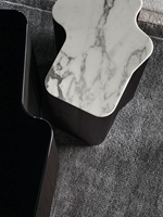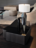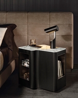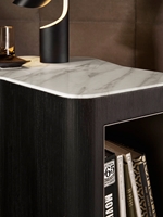 Die Kollektion Lou umfasst auch einen Couchtisch mit drehbarem Untergestell aus lackierter Lärche Liquirizia oder lackiert in den Farben Bruciato, Moka und Muschio und offenen Fächern, die mit bronzefarbenem, satiniertem Metall verkleidet sind. Die Platte ist in Calacatta-Marmor, Rosso Levanto, Verde Lepanto oder schwarzem Pastenglas erhältlich. Lou ist auch als Nachttisch für den Schlafbereich erhältlich und kann in Kombination mit allen Stühlen der Minotti Kollektion in jedem Wohnbereich aufgestellt werden.