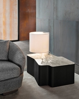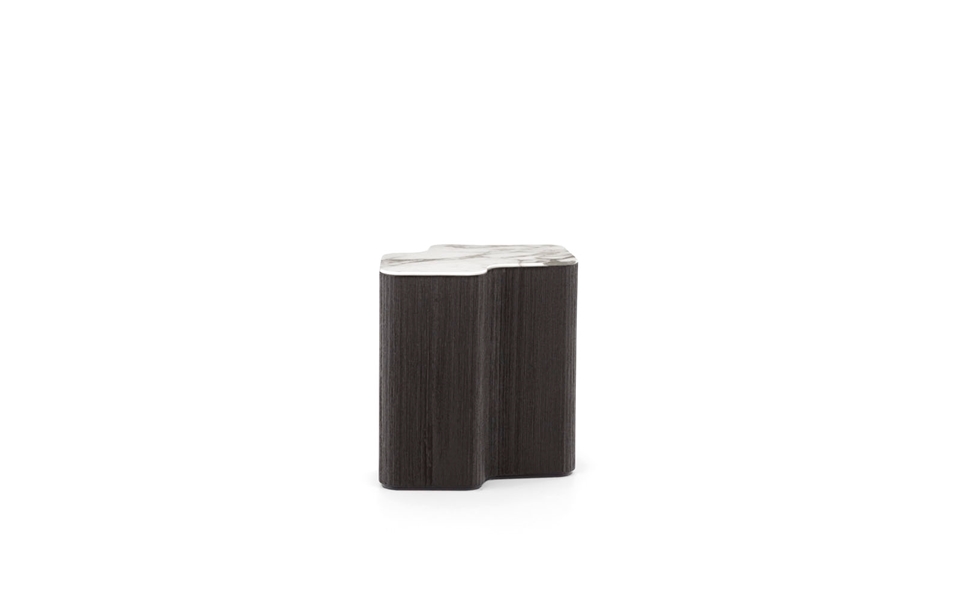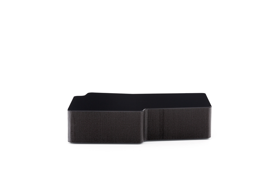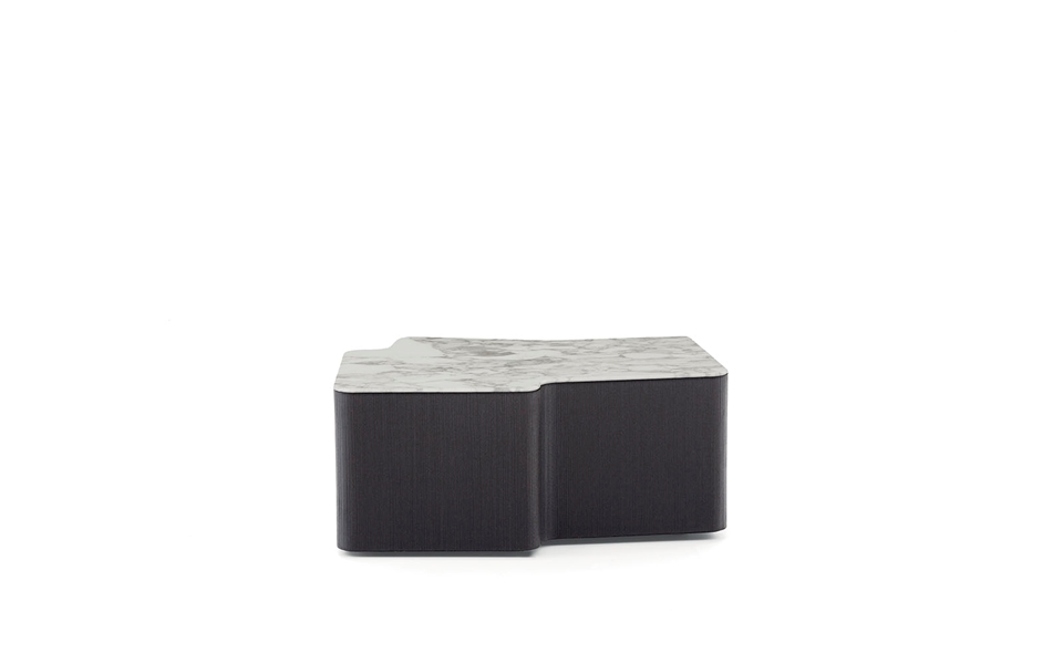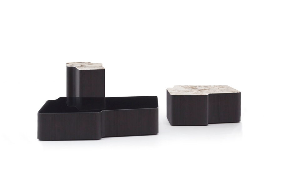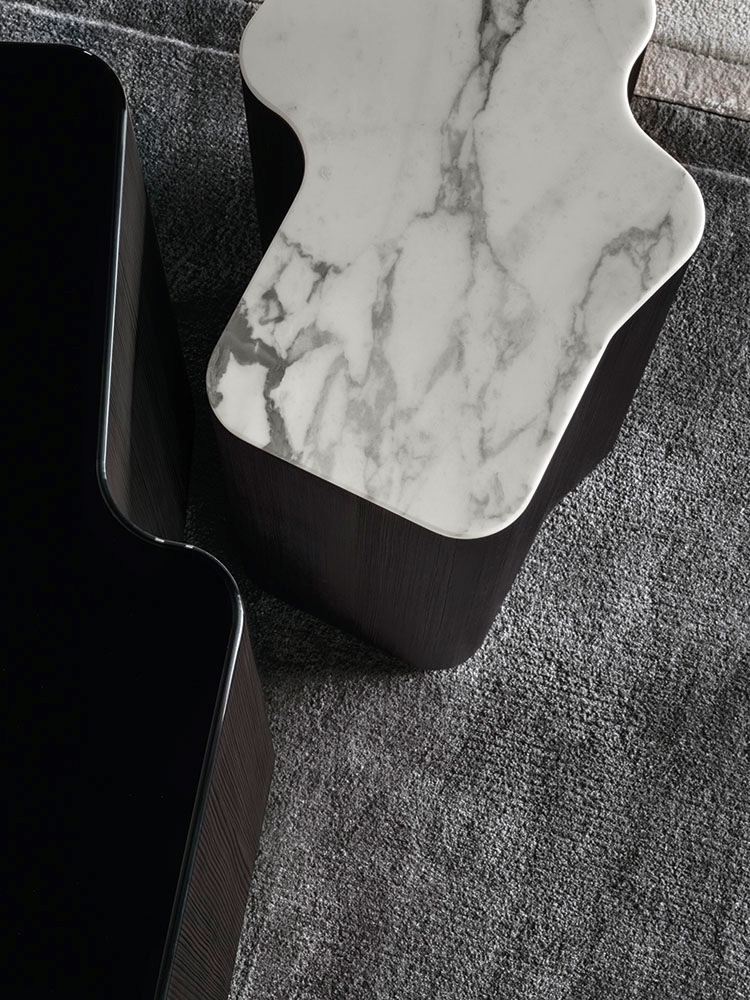 Die Konstruktion dieser Tische erweist sich als besonders komplex und kombiniert moderne Technologie mit traditioneller Tischlerkunst. Die innere, geformte Struktur ist aus MDF-Platte, überzogen mit Sperrholz und Lärchenholzfurnier, und wird dann an den gekurvten Stellen gefräst. Zum Grundgestell aus lakritzefarbig lackierter Esche passen hervorragend die bündig eingelegten Platten aus Materialien, die überraschende Kontraste bilden: Der edle Calacatta Marmor und die kompakte Tiefe der Glaspaste verbinden sich mit der kompakten Realität des Holzes.