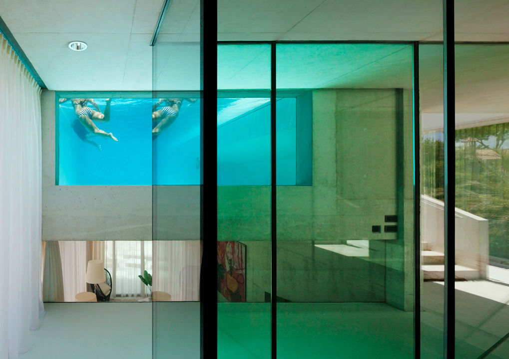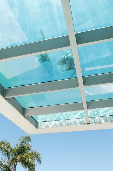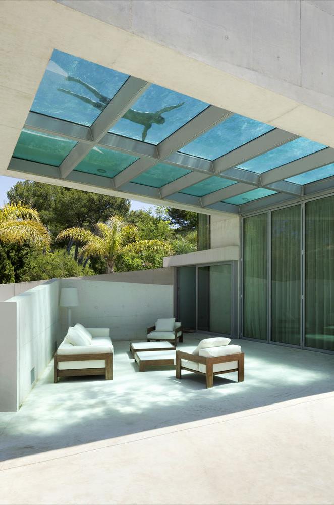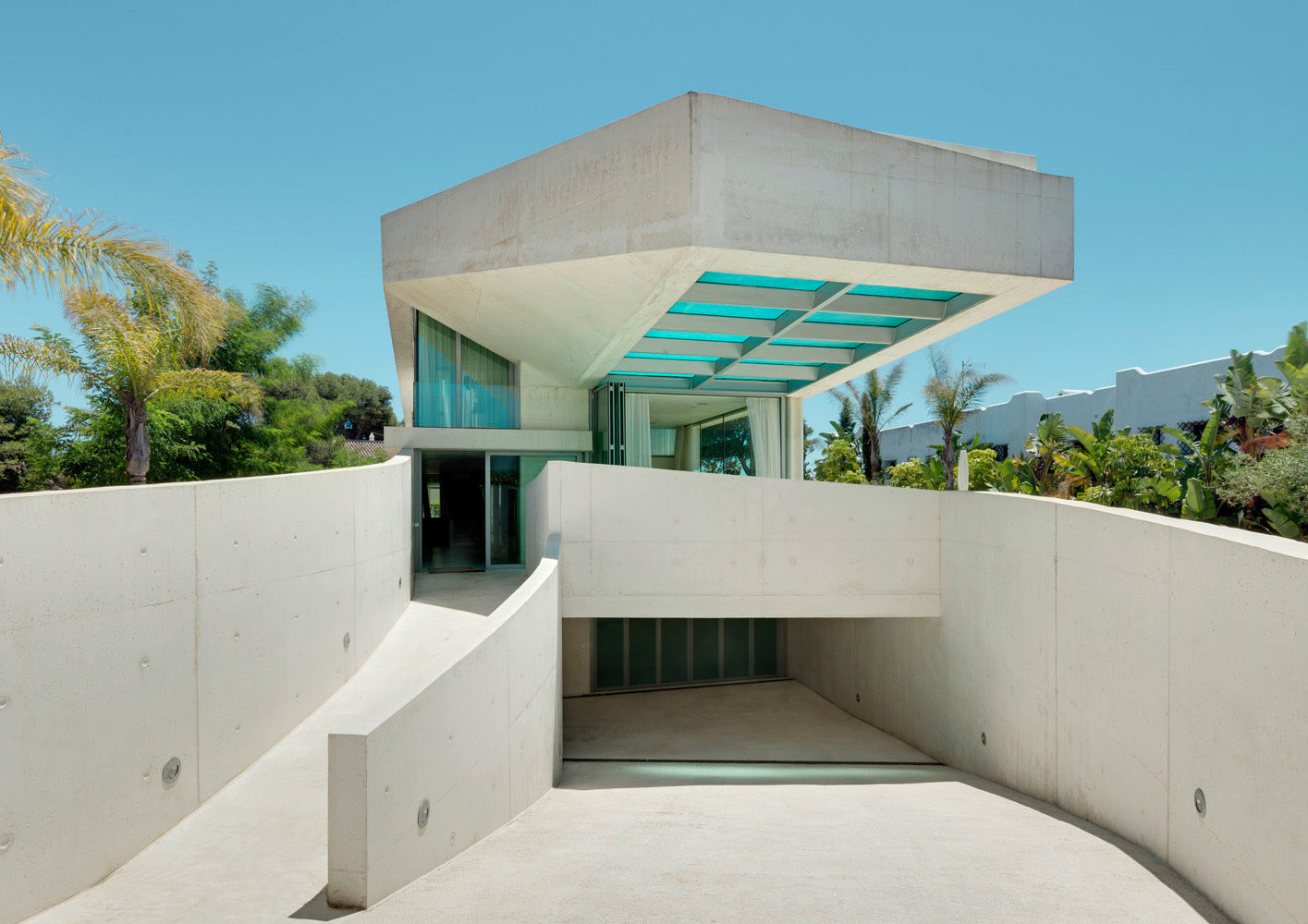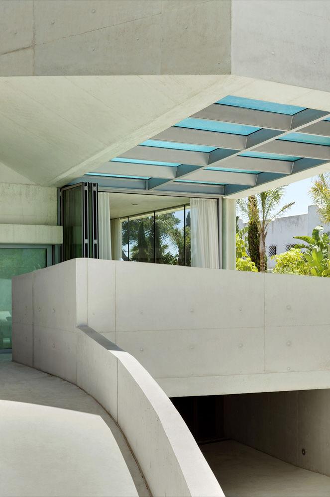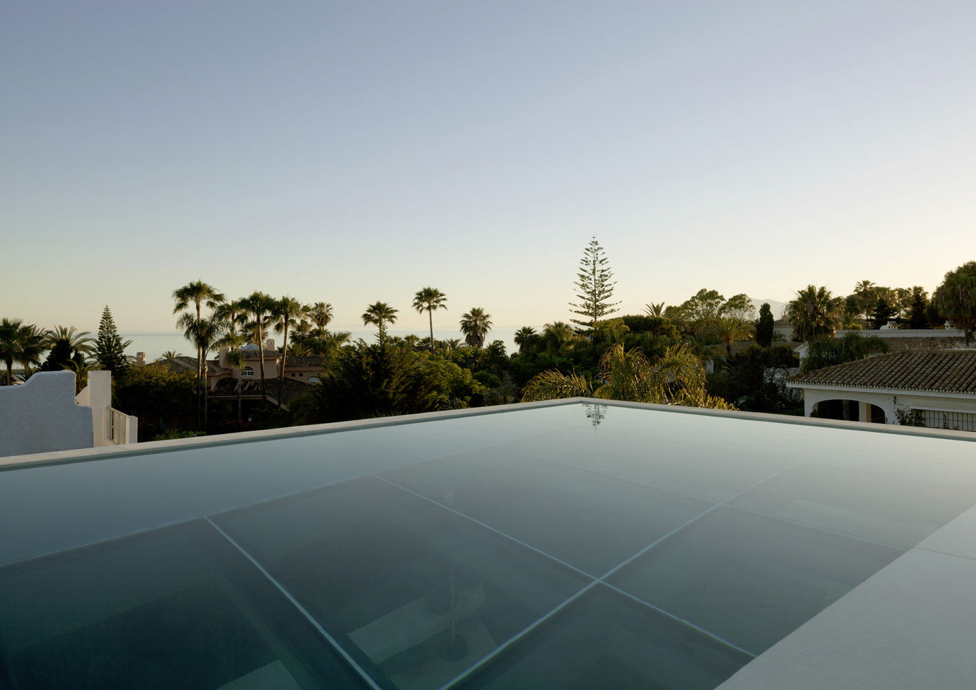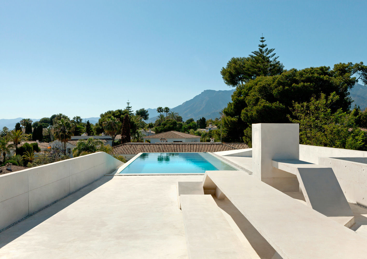 Ein Wohnhaus auf den Hügeln der Costa del Sol im renommierten Ferienort Marbella, der umliegenden Naturlandschaft perfekt angepasst und mit einem spektakulären Pool mit durchsichtigem Boden auf dem Dach des Hauses. Auf der darunterliegenden Veranda, umgeben von üppiger Vegetation, eine elegante, bequeme Relaxzone mit dem Sitzprogramm Alison Iroko "Outdoor".