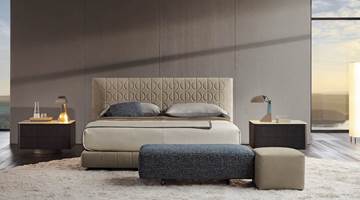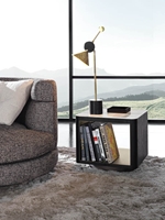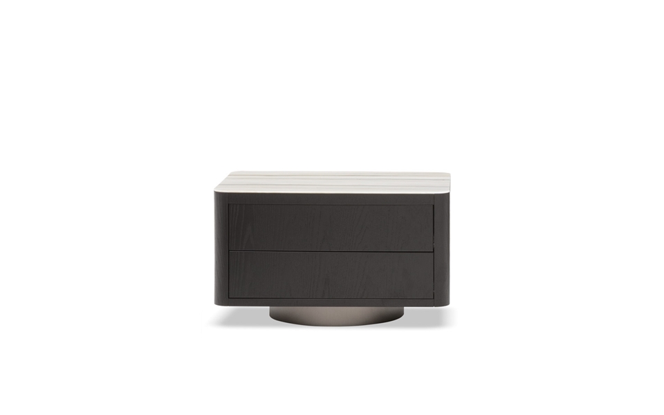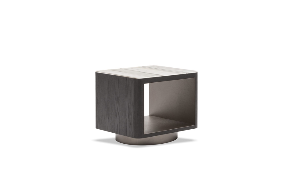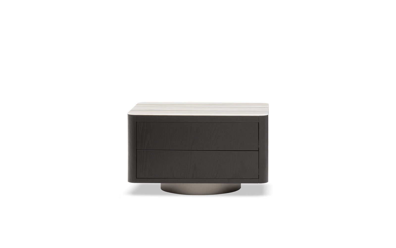 MDF, furniert mit gebürsteter, offenporig, mokkafarbig lackierter Eiche. Die Nachttische verfügt über zwei Schubladen auf Schienen mit Gleitdämpfer und Push-Pull- Mechanismus, internes Finish in der gleichen Farbe wie die Außenfront. Frontale Schubladenöffnung. Nachttische mit durchgehendem Fach sind innen mit satiniertem, bronzefarbig lackiertem Metall ausgelegt. Der Nachttisch 55x55xh50cm mit durchgehendem Fach ist ebenfalls drehbar um 360° erhältlich.