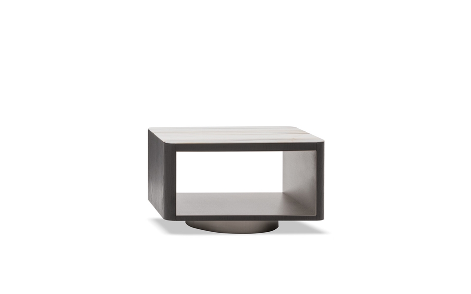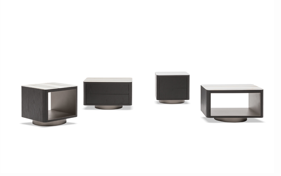 Die Serie wird komplett mit praktischen Elementen in rechteckiger Form mit Schubladen oder durchgehend offenem Fach, auf der internen Fläche mit einer satinierten Metallplatte ausgelegt. Das letzte Modell ist auch in drehbarer Variante erhältlich.