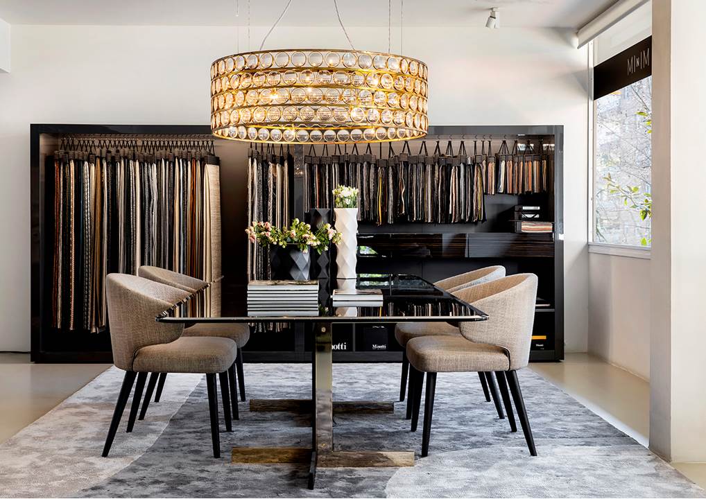 Eine Einladung, die Welt von Minotti zu entdecken, mit einer Präsentation im ersten Stock von Living-Lösungen in einer fließenden Reihenfolge. Hier entfalten mehrere moderne Wohnbereiche ihre Wirkung. Belebt werden sie durch eine sorgfältige Auswahl von Einrichtungsgegenständen, darunter Bestseller und einige Neuheiten der 2019 Collection. Im Mittelpunkt dieses Raums stehen die Sitzprogramme Lawrence und Freeman, während die einander gegenüberliegenden Ecken Platz für das halbkreisförmige Sofa Lawson Medium kombiniert mit den Sesseln Lawson Lounge und dem Tisch Catlin Dining bieten, um den herum die kleinen Sessel Aston Dining aufgestellt sind. Alle Stücke wurden von Rodolfo Dordoni entworfen.