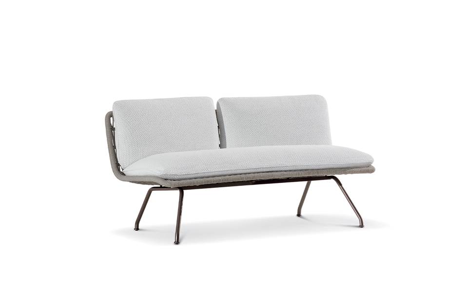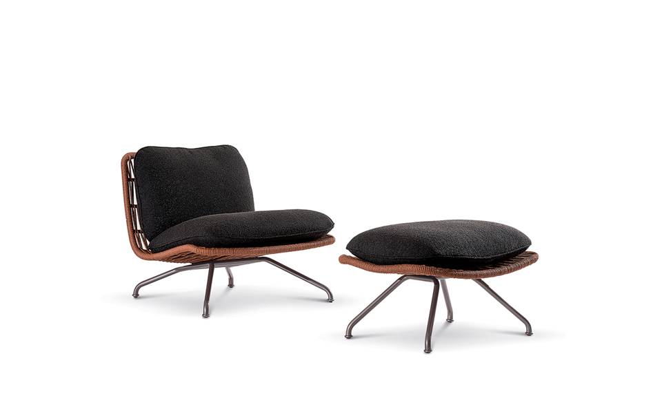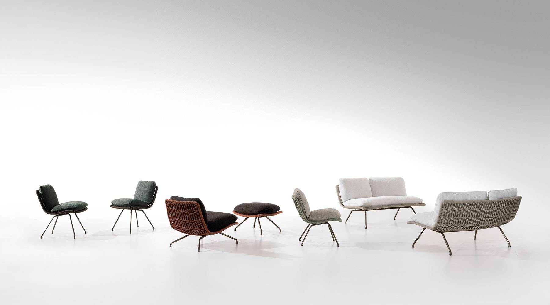 Die vier schlanken Beine schenken den Sitzmöbeln eine leichte und ätherische Optik und betonen den grafischen Effekt des Schnurgeflechts der Sitzschale, deren Ergonomie dank der weichen Sitz- und Rückenkissen noch komfortabler ist.