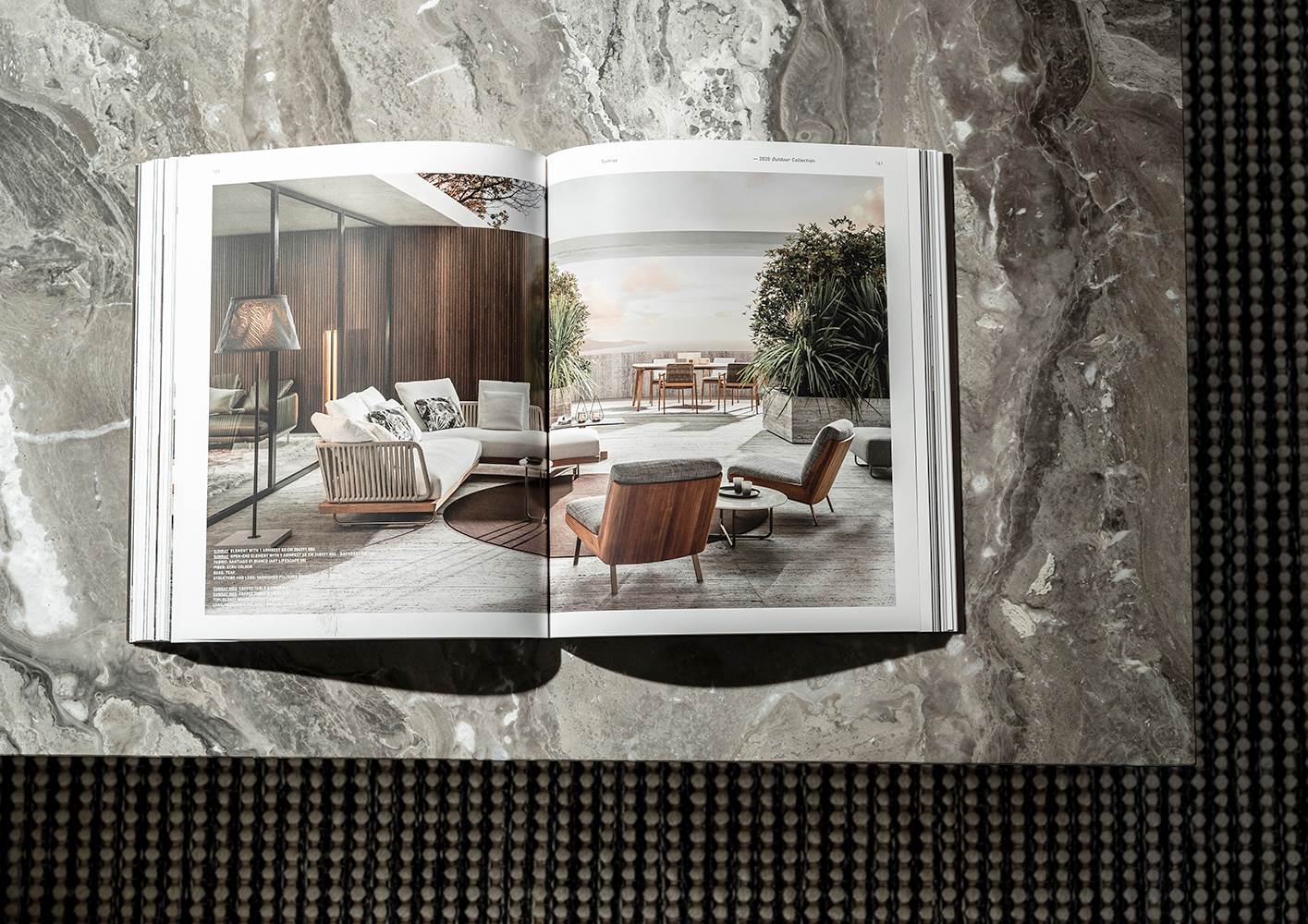Eine reichhaltige fotografische Auswahl wurde den Neuheiten für Indoor und Outdoor der Kollektion gewidmet. Die Bilder spiegeln einen Bereich des zeitgenössischen Modernismus wider, der mit dem für die Haute Couture typischen kunsthandwerklichen Know-how des Unternehmens verbunden ist. Ein Projekt, das auf eine perfekte Kombination von Ästhetik, Design und Couture setzt und Design-Ideen namhafter Designer mit unterschiedlichen kulturellen Matrizen – Rodolfo Dordoni, Nendo, Marcio Kogan / studio mk27, GamFratesi und Christophe Delcourt – aufnimmt, um ein wahres "Projekt Minotti" entstehen zu lassen.