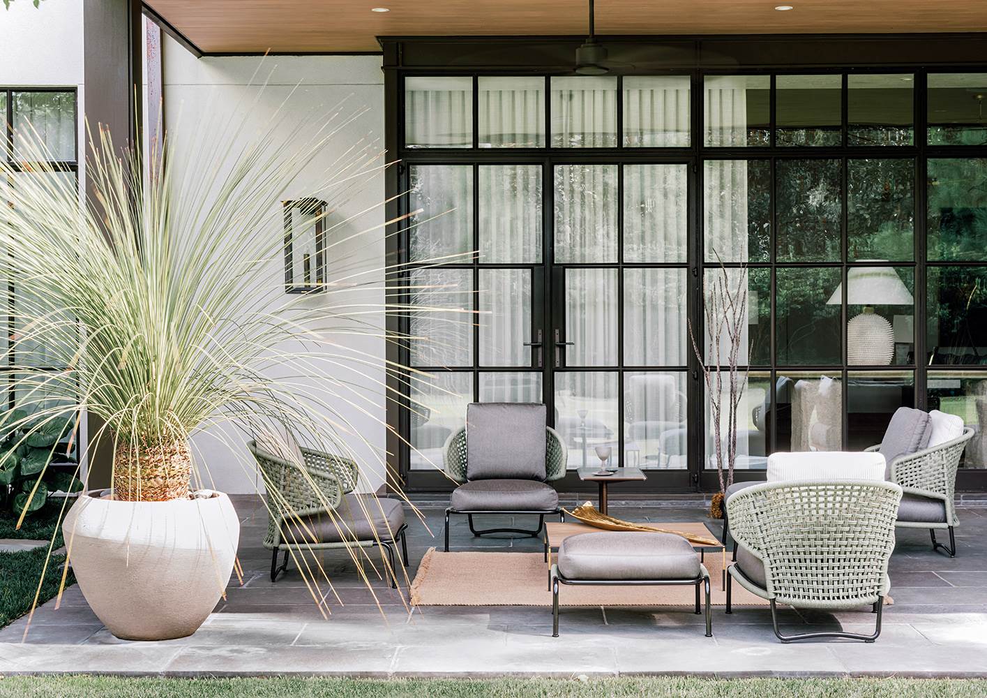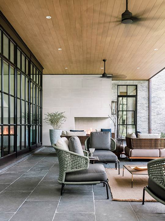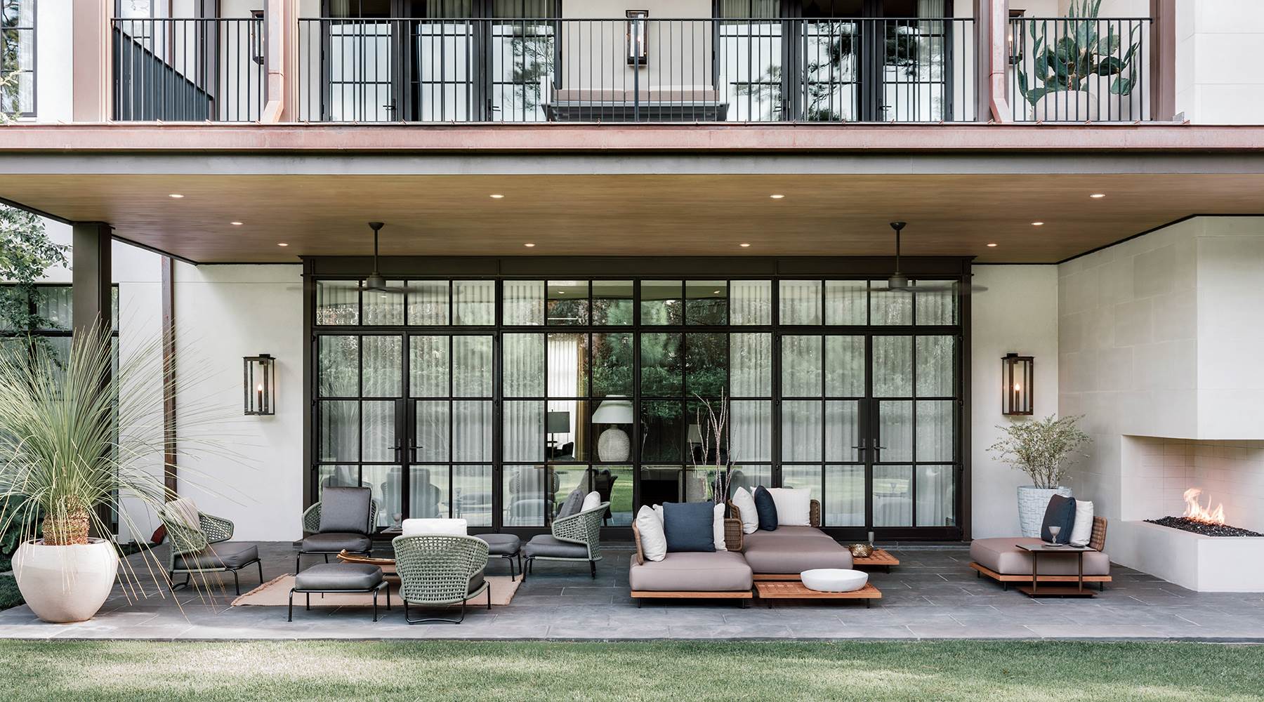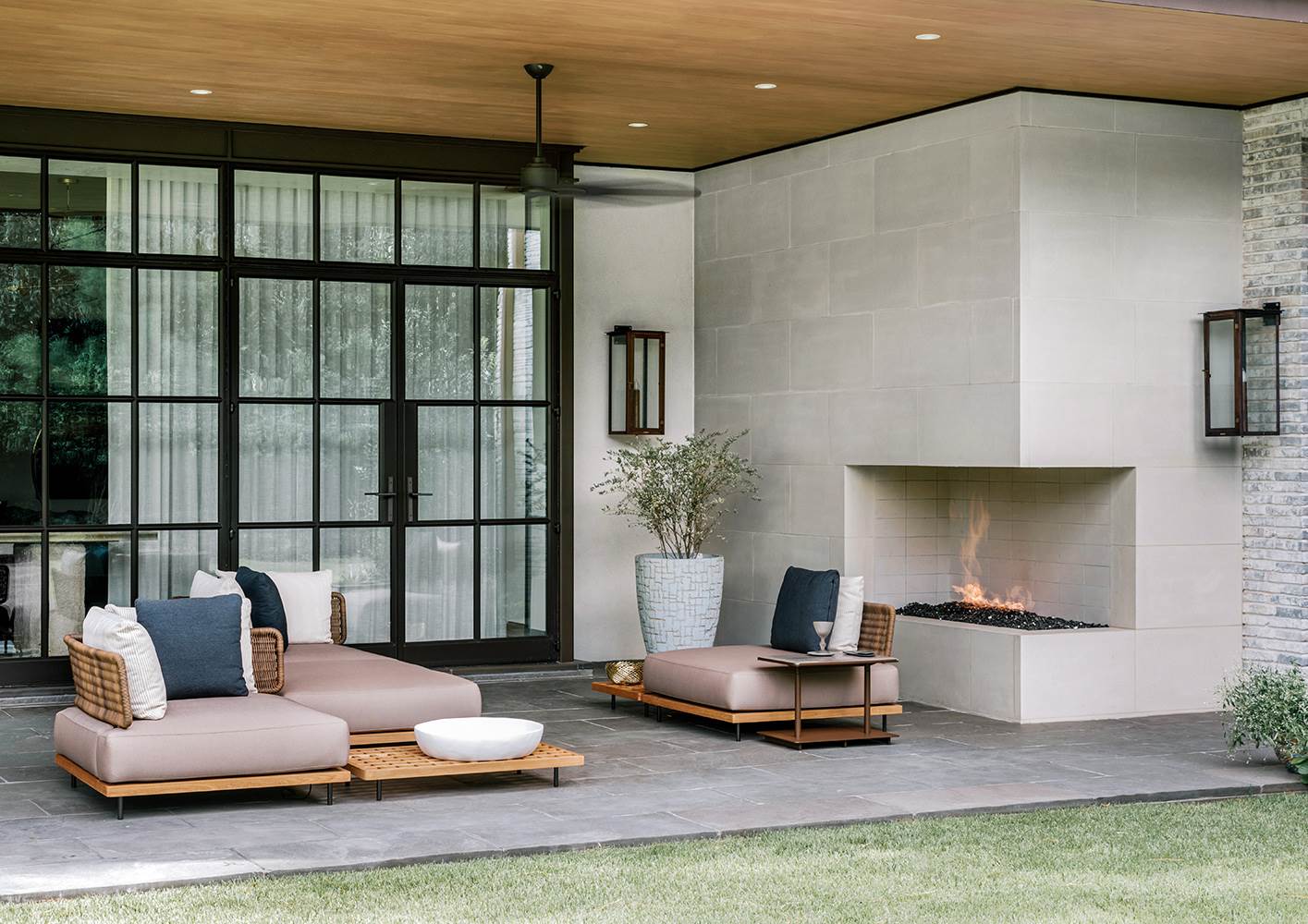 Lambrakos hat für das Projekt River Oaks Manor beschlossen, die Kontinuität zwischen Innen- und Außenbereichen durch Einrichtungselemente von Minotti hervorzuheben, die sich harmonisch in die Umgebung einfügen. Für den Wohnbereich unter dem Patio entschied sie sich für Quadrado von Marcio Kogan / Studio MK27: ein modulares Sofa, das sich durch rechteckige, vom Boden abgehobene Formen charakterisiert. Es ist von Gitterrost-Elementen aus Teak unterbrochen, die auf Booten verwendet werden. Quadrado steht genau gegenüber dem Kamin und zeichnet sich durch eine schlichte, skulpturenhafte und zugleich funktionale Wirkung aus.