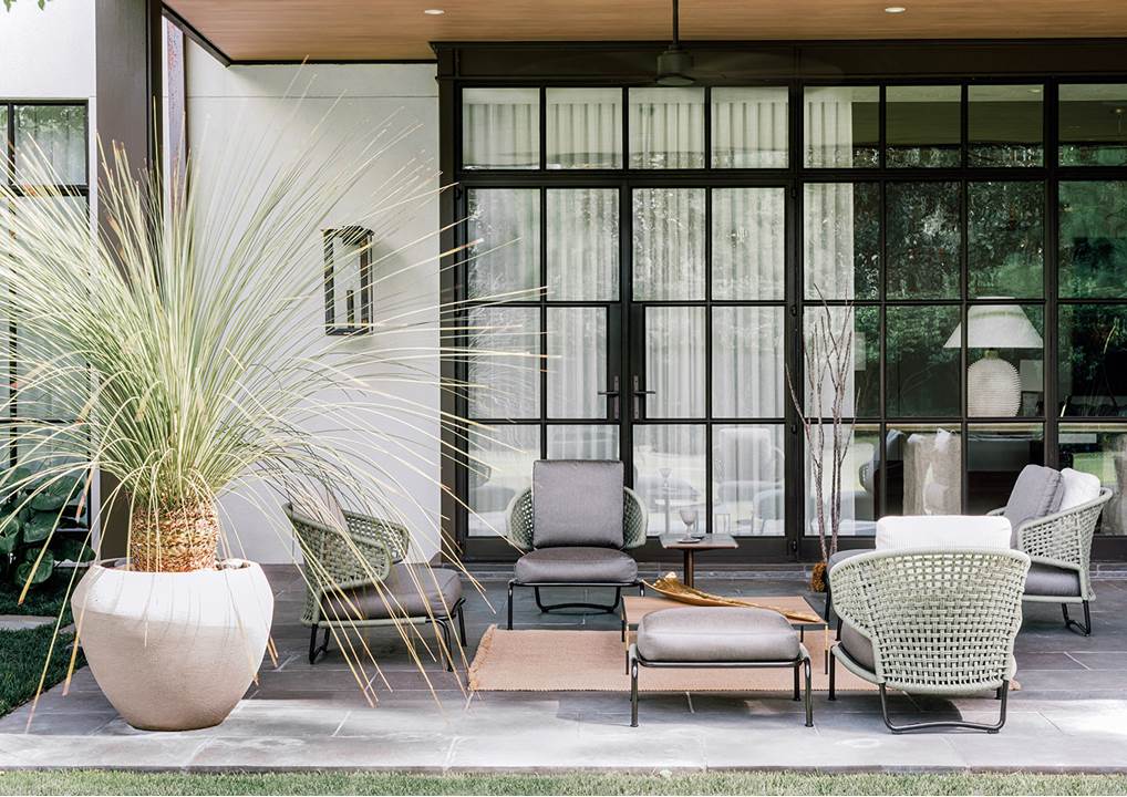 Im Outdoorbereich finden sich auch die von Rodolfo Dordoni für Minotti entworfenen Flechtsessel Aston "Cord" Outdoor. Sie stehen im Dialog zu den geflochtenen Rückenlehnen von Quadrado und unterstreichen zusätzlich die von der Designerin gewünschte natürliche Wirkung.