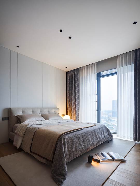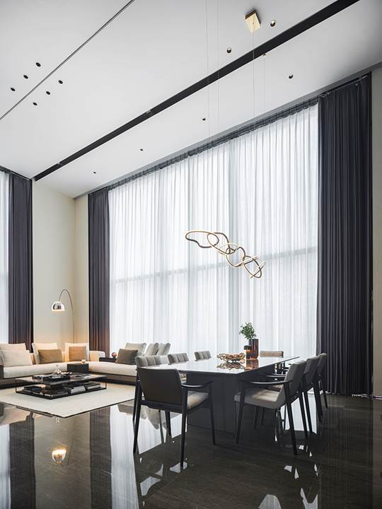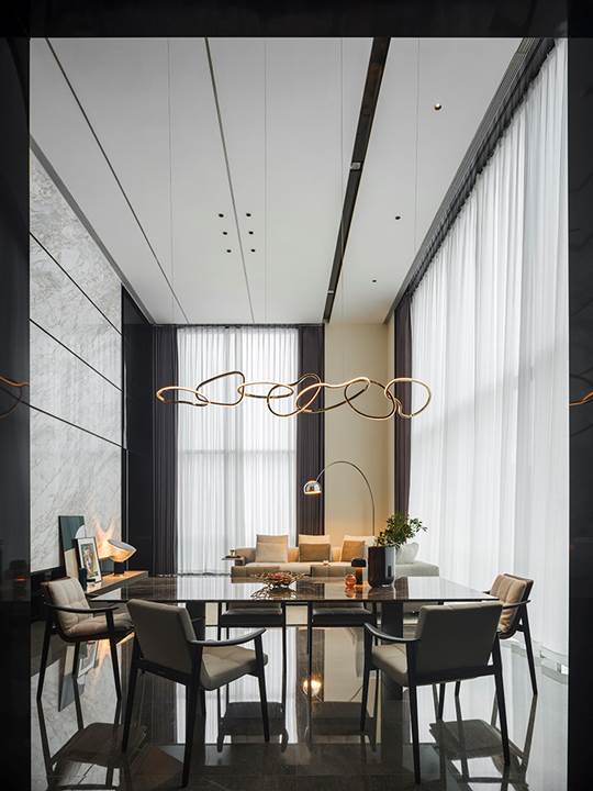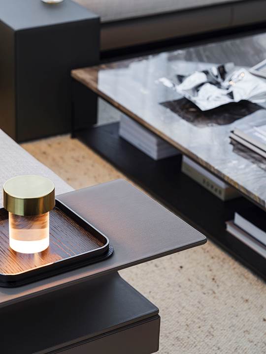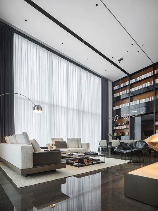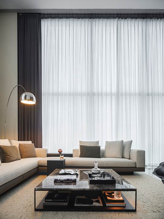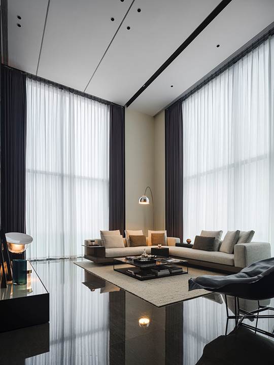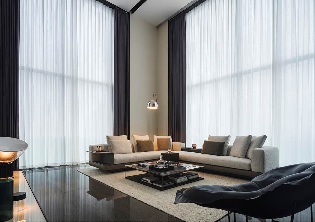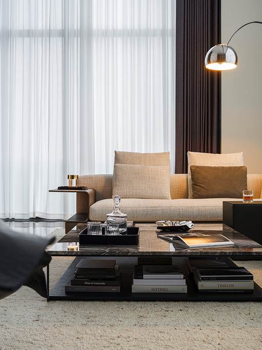 Die 360 Quadratmeter große Wohnung befindet sich in der Wohnanlage Rongchuang Center Nr.1 im Zentrum von Wuhan, China. Die Inneneinrichtung zeichnet sich durch einen Stil aus, der mit dem zeitgenössischen Charakter des Gebäudes übereinstimmt und dennoch komfortabel und harmonisch ist, reich an raffinierten Details. Der absolute Blickfang ist das von Rodolfo Dordoni entworfene modulare Sitzprogramm Connery, das den zeitgenössischen Charme des amerikanischen Mid-Century-Geistes ausstrahlt, bereichert durch edle Materialien und Minottis eigene handwerkliche Verarbeitung. Die große Eckkomposition wird durch den niedrigen Tisch Liam, ebenfalls von Rodolfo Dordoni, abgerundet, dessen Formensprache zwar wesentlich ist, nicht jedoch die Wahl seiner Materialien: glänzend zinnfarbener Stahl für die schlanke Struktur und Grigio Orobico Marmor für die Tischplatte.