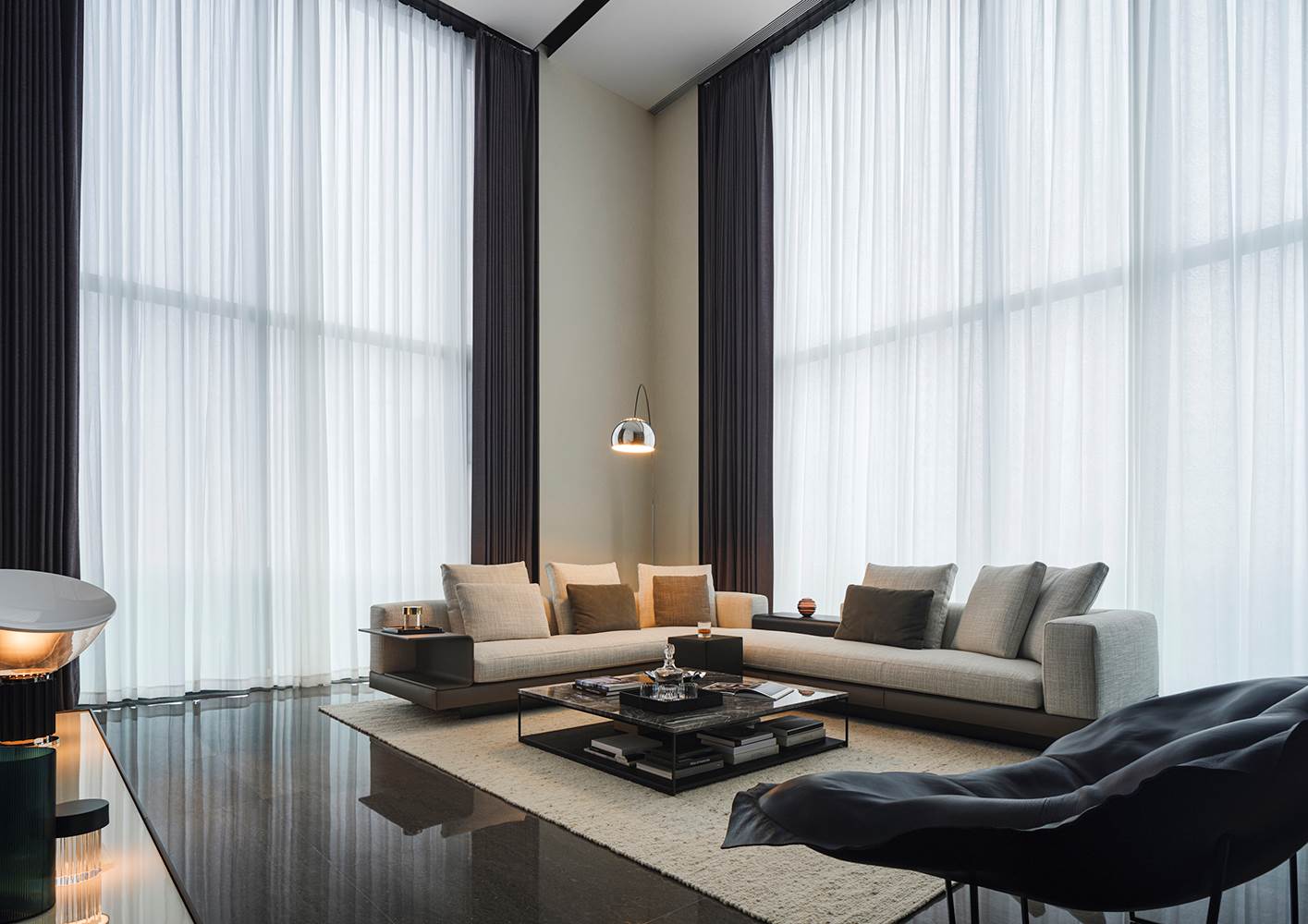 Das durch die deckenhohen Fenster einfallende natürliche Licht untermalt den eleganten Komfort der Einrichtungsgegenstände von Minotti, die durch weiche, helle Stoffe und raffinierte, reflektierende Oberflächenausführungen bestechen.