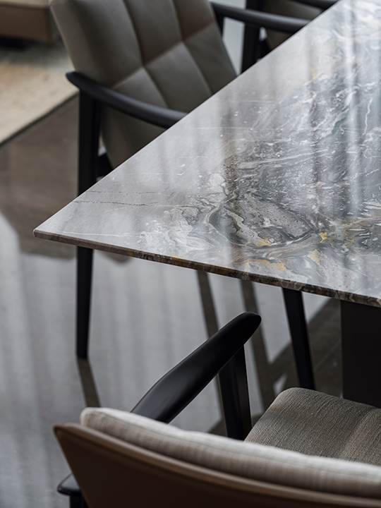 Das Wohnzimmer setzt sich im Essbereich fort, wo der von Marcio Kogan / Studio MK27 entworfene Tisch Linha den Couchtisch Liam mit seiner Platte aus der gleichen Art von Marmor aufgreift. Der Tisch, bei dem der architektonische Minimalismus und die konstante Suche nach Eleganz in den Proportionen, die für das brasilianische Studio typisch sind, offensichtlich sind, wird von den Fynn Esstischsesseln von GamFratesi begleitet, die stattdessen die gelungene Begegnung zwischen skandinavischen Designwerten und italienischer Fertigungstradition zum Ausdruck bringen.