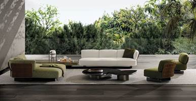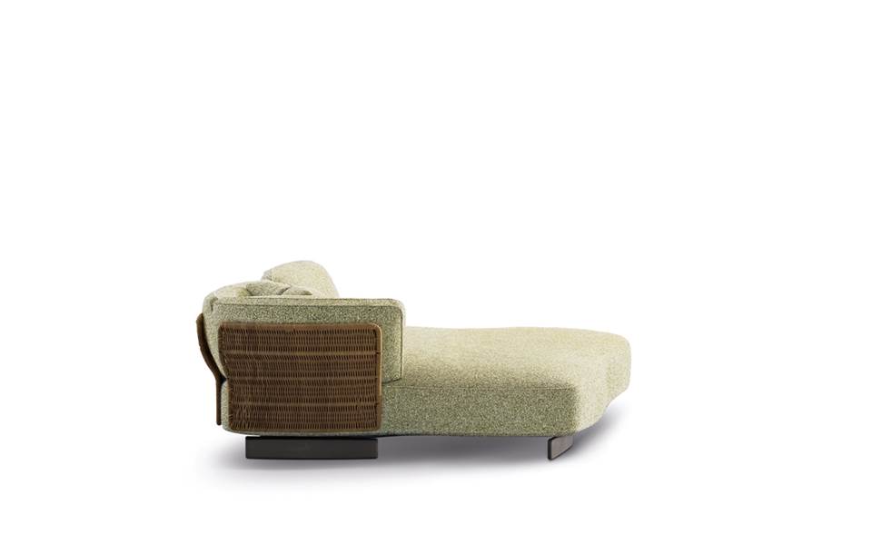 Eine Entspannungsinsel mit organischen Formen, die an eine Blüte erinnert und zum Mittelpunkt einer geselligen Atmosphäre wird: Saki Cord Outdoor ist in verschiedenen Konfigurationen erhältlich und verfügt über blütenförmige Elemente in Korbflechtoptik, die als Rücken- oder Armlehnen dienen.