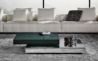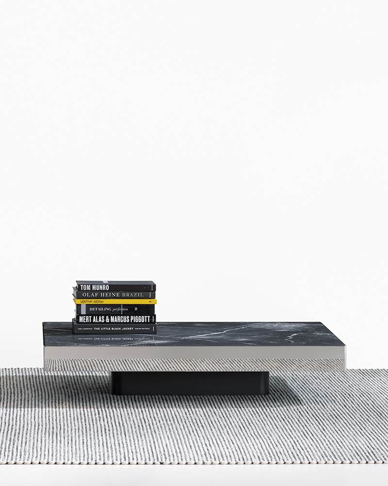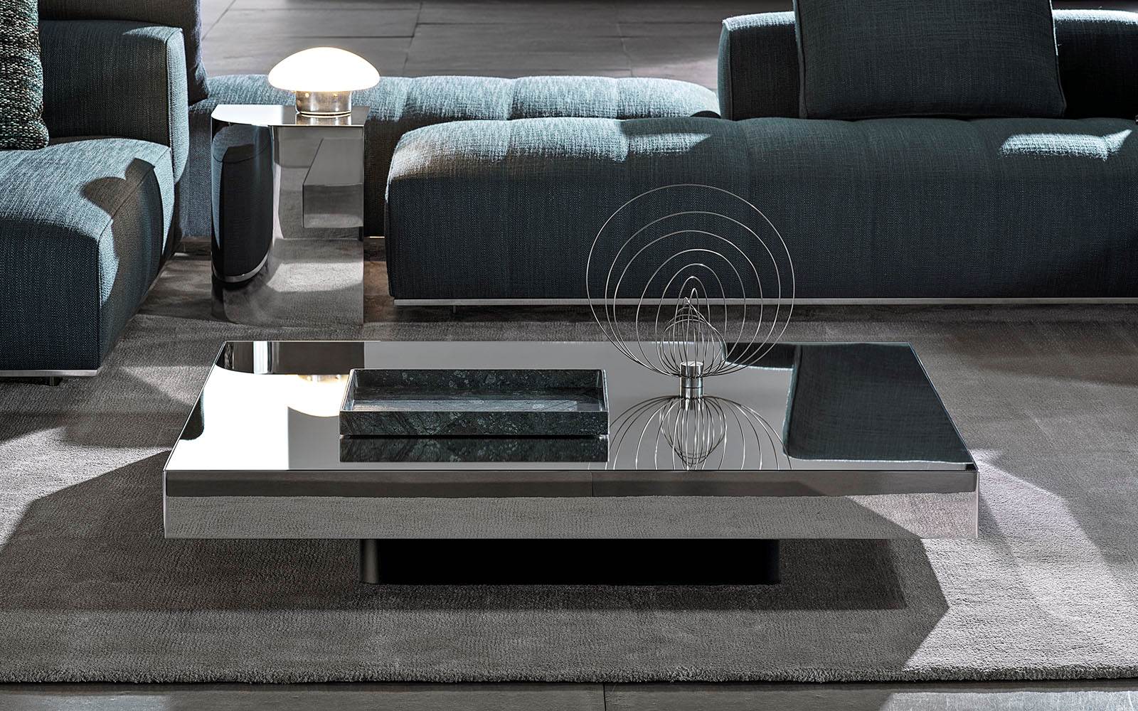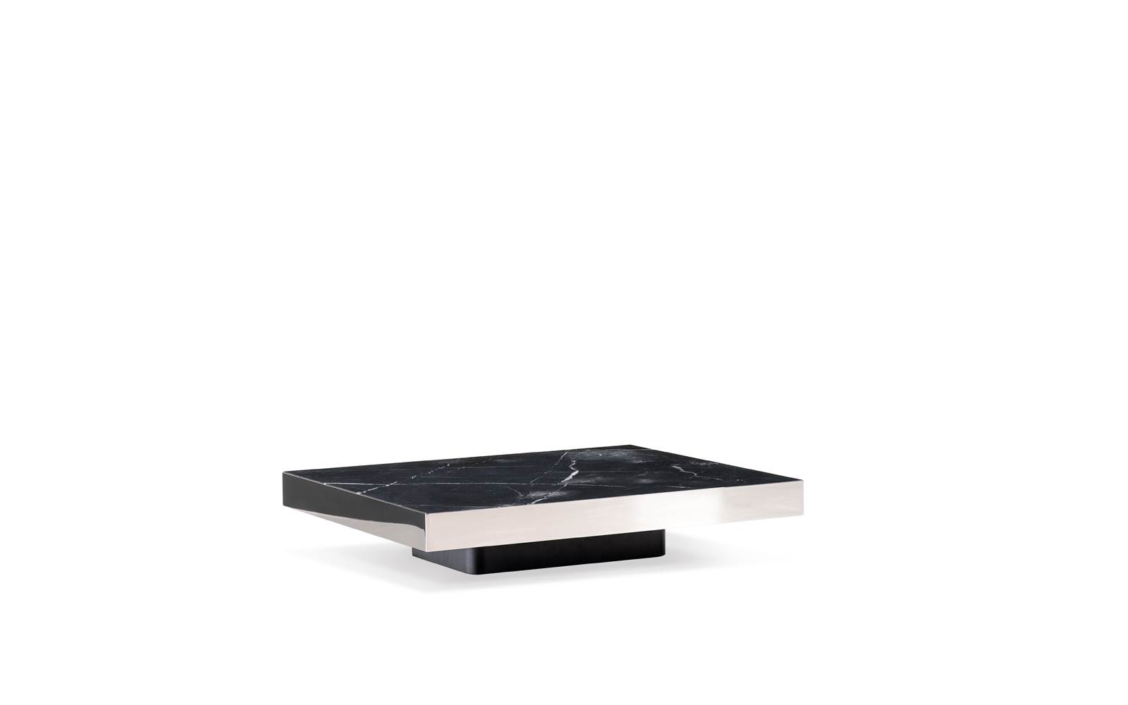 Die Wahl der Farben steht im Einklang mit der Bildsprache des Wohnraums, der sie inspiriert hat: spiegelnder Edelstahl in Kombination mit farbigen Lacken, Holz und Marmor, der einer speziellen, gesehliffen unterzogen wurde, die die matte Materialität hervorhebt und im starken Kontrast zum Glanz des verspiegelten Stahlrahmens steht. Eine typische Sprache der Marke, die es versteht, Einfachheit in Raffinesse zu übersetzen und ein Einrichtungsaccessoire in eine starke und erkennbare Präsenz zu verwandeln. Die Wesentlichkeit ihrer Form macht diese Beistelltische zu architektonischen Objekten von starkem Charakter, die sich in die Gesamtästhetik des Raumes einfügen und dennoch leicht in vielen Kontexten positioniert werden können: im Bereich vor dem Sofa, aber auch dezentral im Wohnbereich, wo sie zu einem Ablageelement werden, das das Ambiente perfekt abrundet.