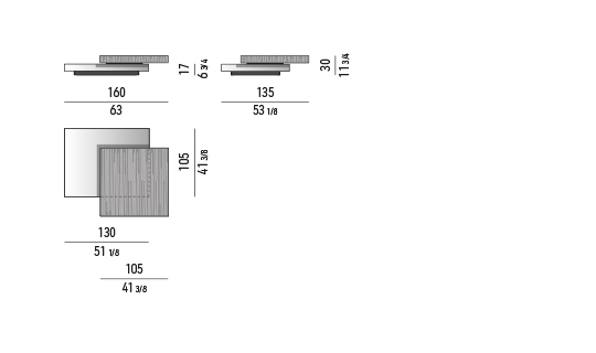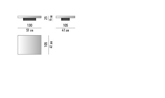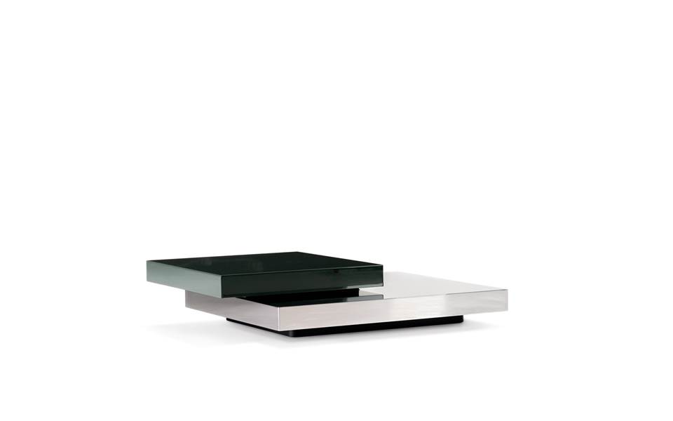 Bei Solid Steel handelt es sich um Quader mit einer oder zwei versetzten Ebenen. In der Variante mit zwei Ebenen ist die obere Platte glänzend lackiert in Mokka, Cappuccino, Malachit, Kastanie oder offenporig lackierter Esche in der Farbe Mokka, während die untere Ebene aus einer Struktur aus poliertem Edelstahl mit verspiegelter Platte besteht.