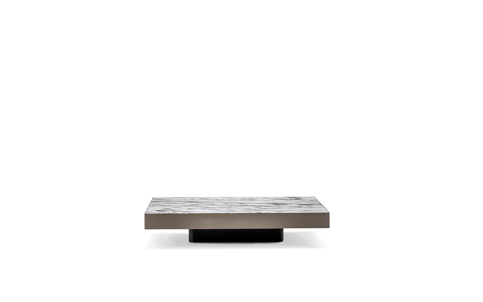 Bei der Monoblock-Version hingegen ist die Struktur immer aus poliertem Edelstahl oder polierter Bronze mit vier möglichen Ausführungen der Platte: Marmor Arabescato Grigio, Marmor Nero Marquina, offenporig lackierte Esche in der Farbe Mokka oder verspiegelt.