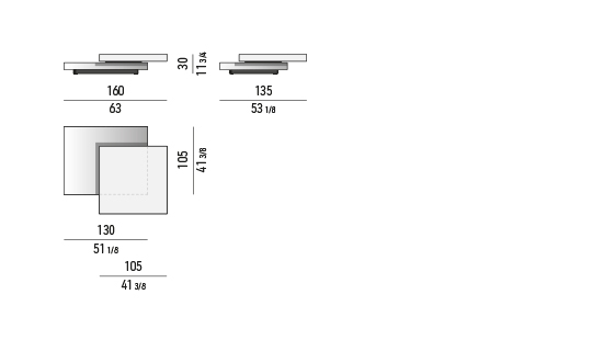 Struktur: unteres Element aus MDF mit Kantenbeschichtung aus Blech, Stärke 3 mm, aus glänzendem Edelstahl. Verspiegelte Tischplatte, Stärke 5 mm. Oberes Element aus MDF, glänzend lackiert in den Farben Cappuccino, Kastanie, Malachit oder Mokka oder mit Eschenfurnier mit offenporiger Lackierung in der Farbe Mokka.