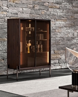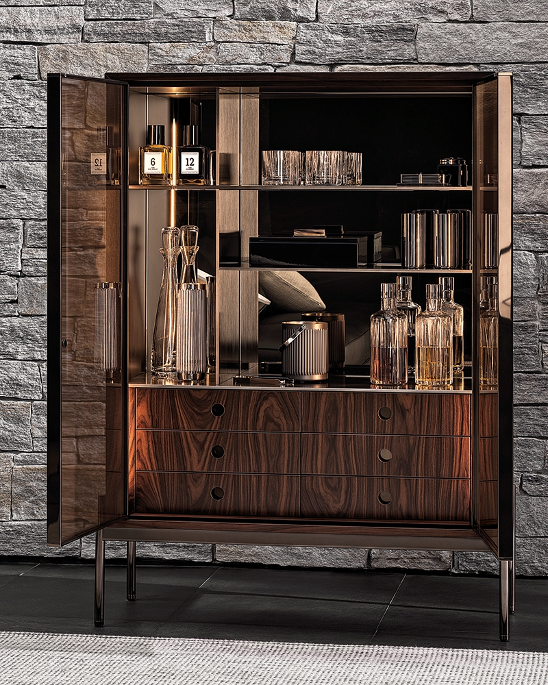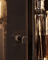 Das Barmöbel, das in einer einzigen Größe von 105 cm erhältlich ist, fällt der Rahmen der Türen aus Verbundglas ins Auge, die mit einem inneren Kupfermetallgitter verbunden sind. Das Gitter gibt den Blick auf das Spiel der Reflexionen frei, dass durch die bronzierten Spiegelrückwand und die doppelte an den Seiten der Struktur verlaufende Lichtleiste erzeugt wird. Im Innern des Barmöbels verbirgt sich ein Schubladenelement aus Palisander Santos Dark Brown gebeizt, Polyester matt lackiert.