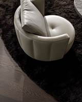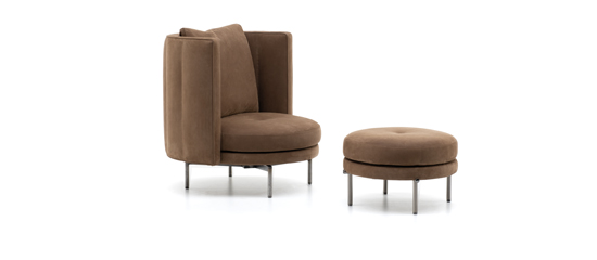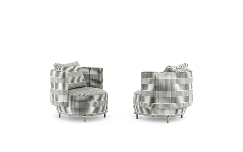 Die Sessel hingegen sind in einer festen oder drehbaren Ausführung erhältlich, letztere mit einem geschwungenen Metallfuß, der den Drehmechanismus verdeckt.