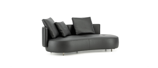 Torii Bold zeichnet sich durch den Kontrast zwischen den großen, sanft gerundeten Volumina der gepolsterten Teile und der Leichtigkeit des Metallsockels aus, auf dem sie ruhen.