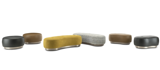 Die Poufs in verschiedenen Formen und Größen greifen das Design des Sessels auf. Sie werden auf Rollen angeboten, um sie leicht bewegen zu können, und ermöglichen ein ungezwungeneres Wohnen.