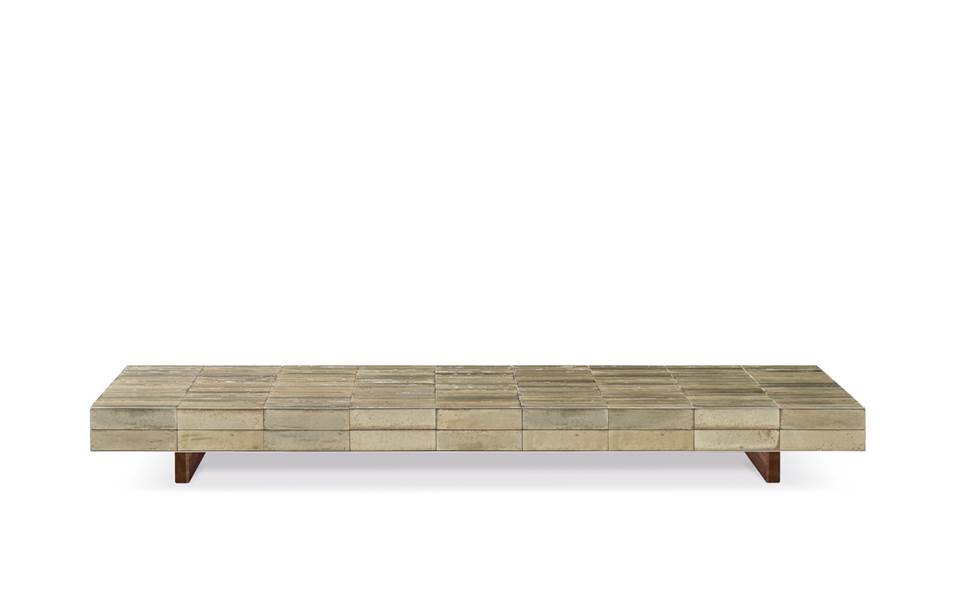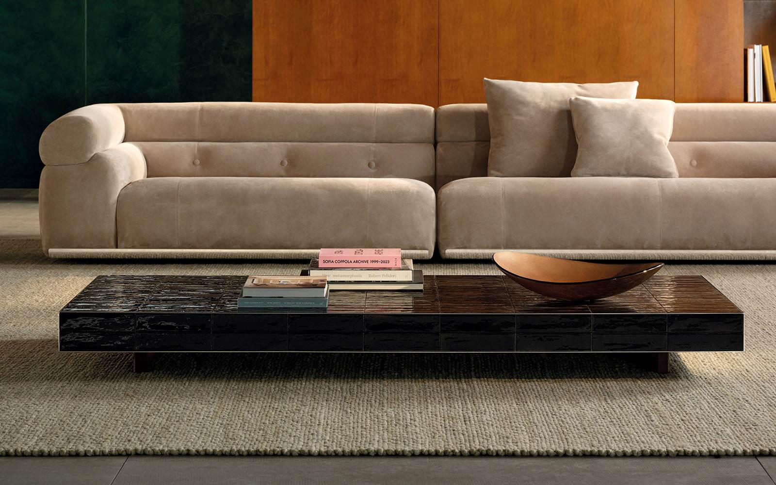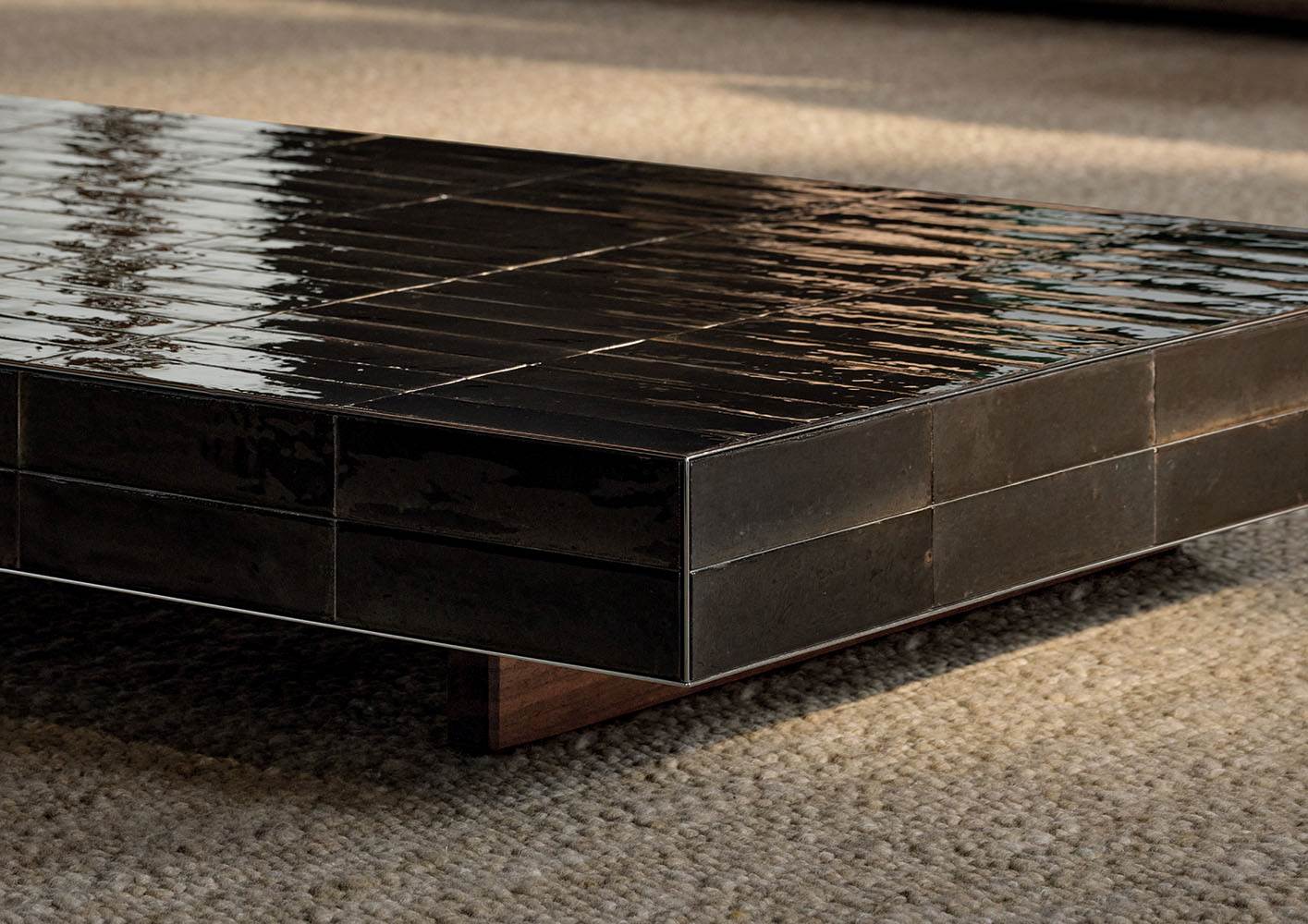 Its rigorous geometry is counterpointed by the texture of the glazed ceramic tile, which gives it a distinctive artisanal touch but, above all, makes it shimmer in the light, animating the living area. The choice of this material, which is never the same twice, makes each coffee table fascinating for its uniqueness, as well as extremely durable due to its technical properties.