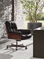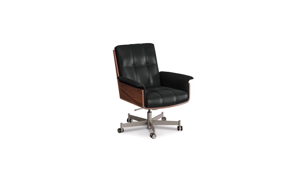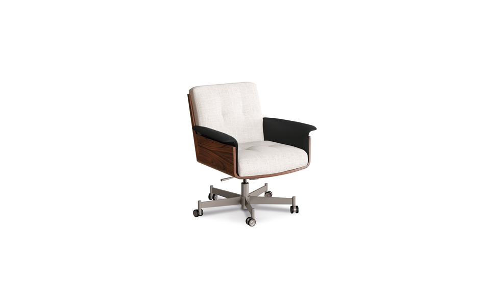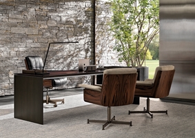 Alongside an Executive armchair on wheels, with high backrest and a five-spoke base in Bronze-coloured varnished steel – a 360° swivel base with no return mechanism, but with height and rocker adjustment mechanisms – four more armchairs with lower backrest are available: an armchair with the same characteristics of the Executive armchair, but smaller; an armchair with a 360° swivel base composed of four spokes and feet, with return mechanism; a lounge armchair with legs in aluminium and, finally, a version of the same piece that is 10 cm taller, ideal for setting beside a table or a desk.