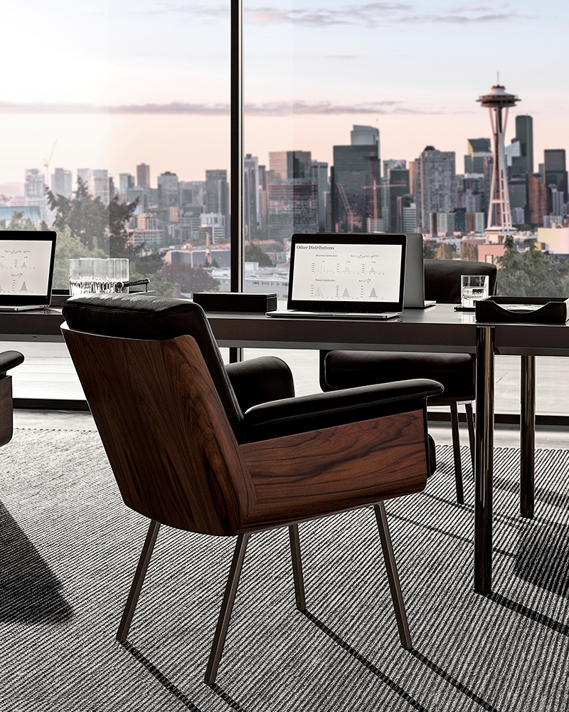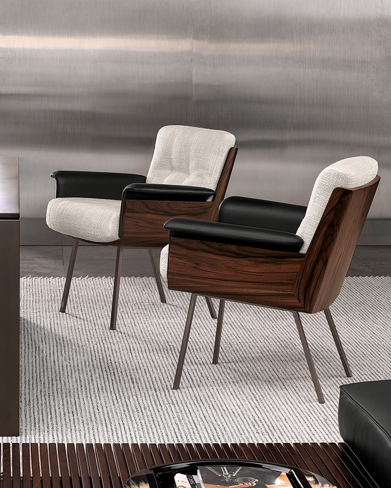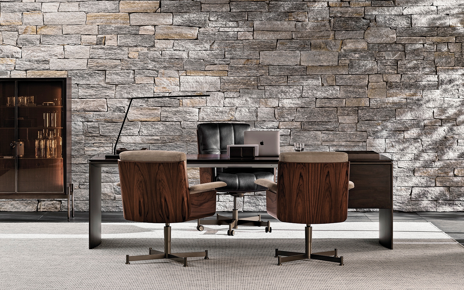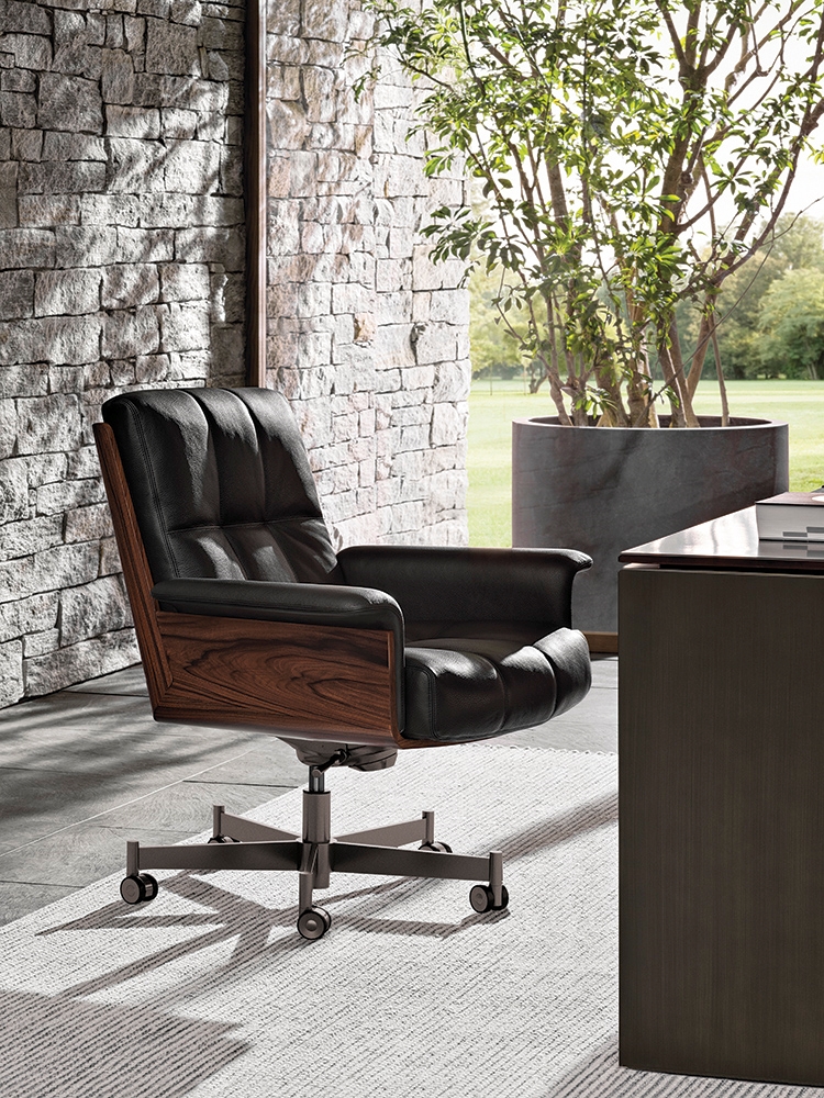 All the armchairs can be completely covered in leather or fabric, or feature armrests in Carbone-coloured Aspen leather and fabric cushioning. The cover, in leather or fabric, always features stitching, except in the Executive version, which also sports a slightly quilted effect.