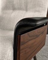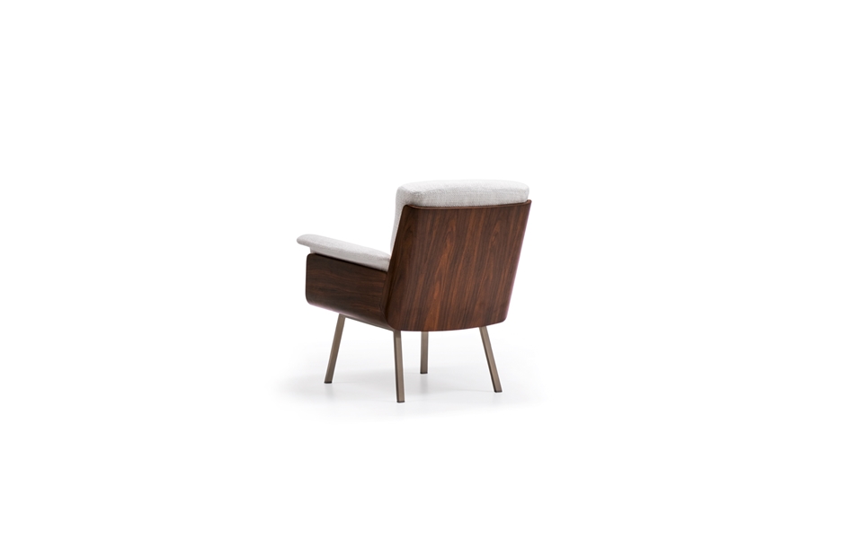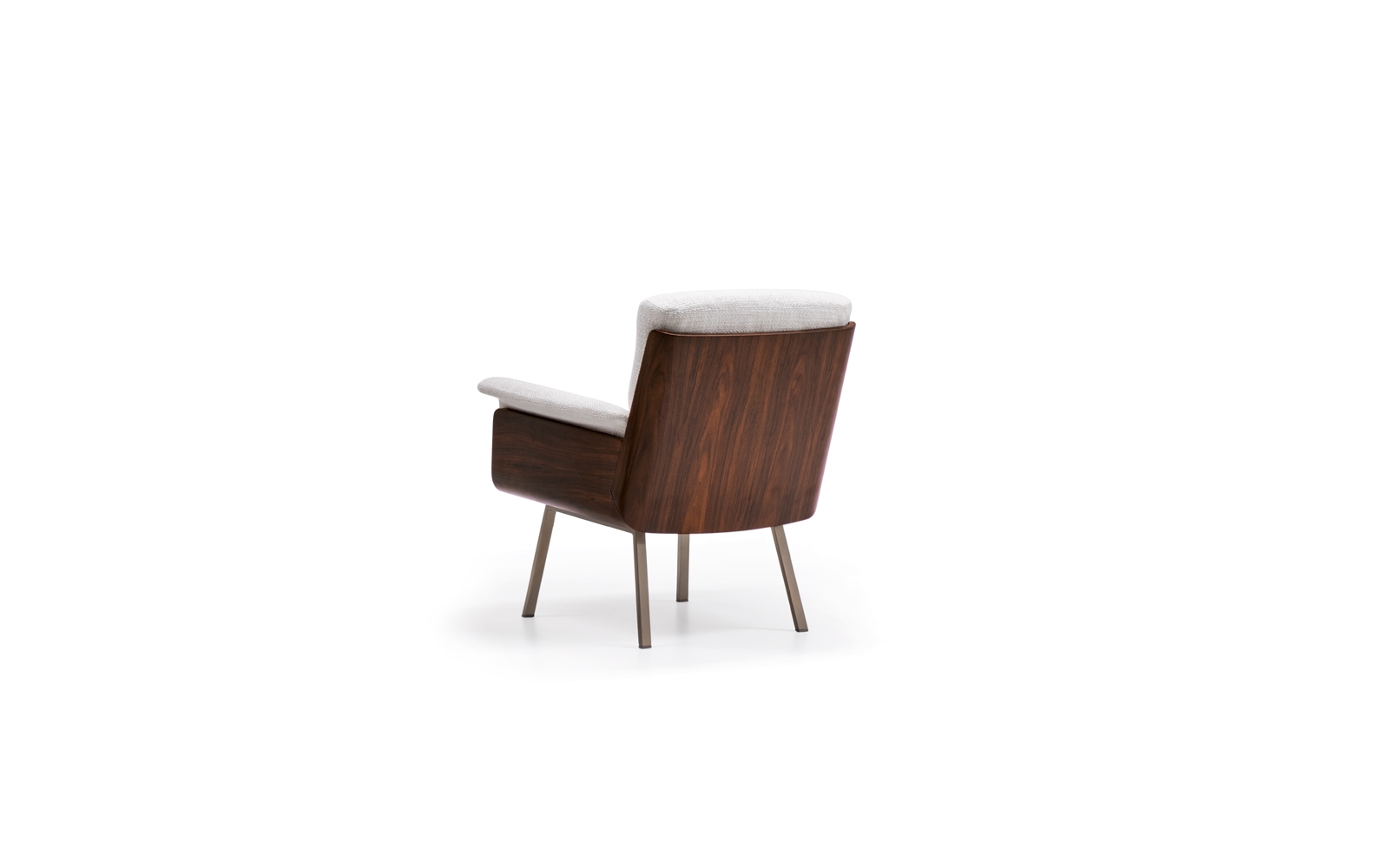 Made using sophisticated wood crafting techniques, the curved body is composed of two elements joined at a 45° angle, which guarantee maximum comfort. In Dark Brown stained palisander Santos, or Black-coloured open-pore lacquered flamed ash wood, the body provides a snug fit for the cushioning.