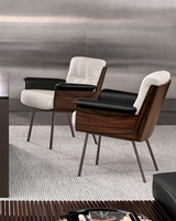 In beech plywood with flamed ash veneer with open-pore Black colour lacquer finish, or in palisander Santos*, stained Dark Brown with polyester matt lacquer finish. Crafted on CNC machines and assembled with dowel joinery. Armrests in aluminium sheet coated in integral skin polyurethane foam and upholstered in fabric or leather.