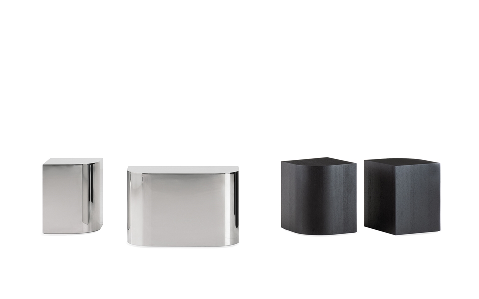 The James coffee table stands out for its sculptural form: a monolith in Liquorice-lacquered ash or in mirror-finished polished steel.