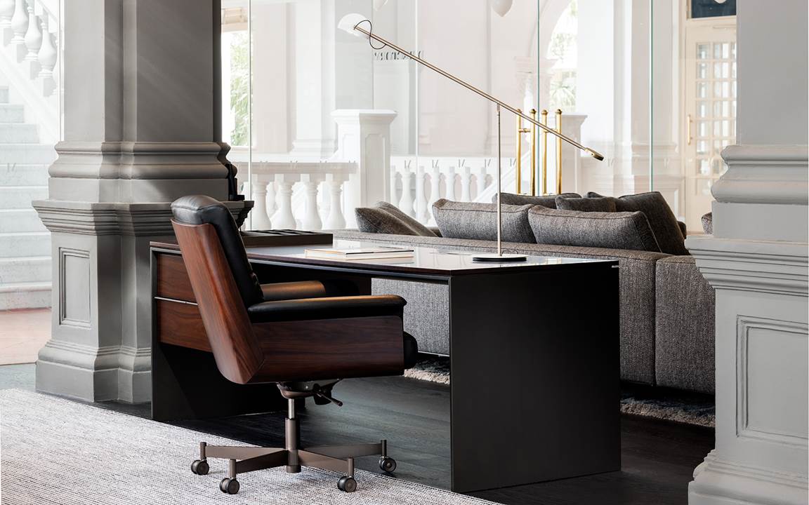 The largest display area, characterised by traditional frames enhanced by white plaster walls and impressive columns painted in the typical Minotti shade of grey, houses two important compositions of the Roger seating system by Rodolfo Dordoni, in a game of mix and match colours and materials; behind them there is an office corner composed of the Linha Studio desk and the Daiki Studio armchair, designed by Marcio Kogan / studio mk27.