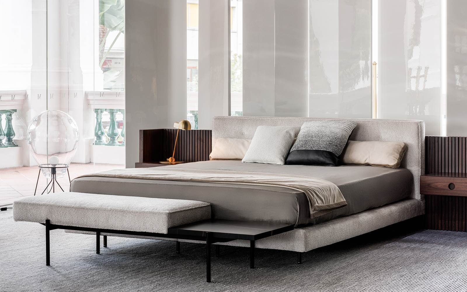 The adjacent environment, renamed the “glass cube” after its glass walls, also welcomes a brand new setting: the protagonists are the furnishing pieces by Marcio Kogan / studio mk27, such as the Brasilia Bed for the night area and the Superquadra table with the Daiki Studio armchairs and Brasilia seating system for the living room.
