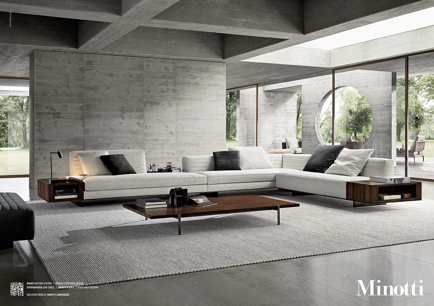 The compositions chosen for the campaign provide examples of the many possible configurations of Roger, which is based on the idea of an open design, to be composed with a touch of imagination and personalised with elegance. Extremely versatile, it is designed to respond to all requirements and uses and its eclectic side means it can cater for a variety of taste targets.