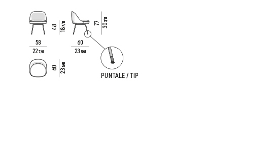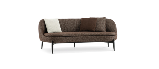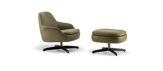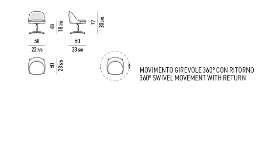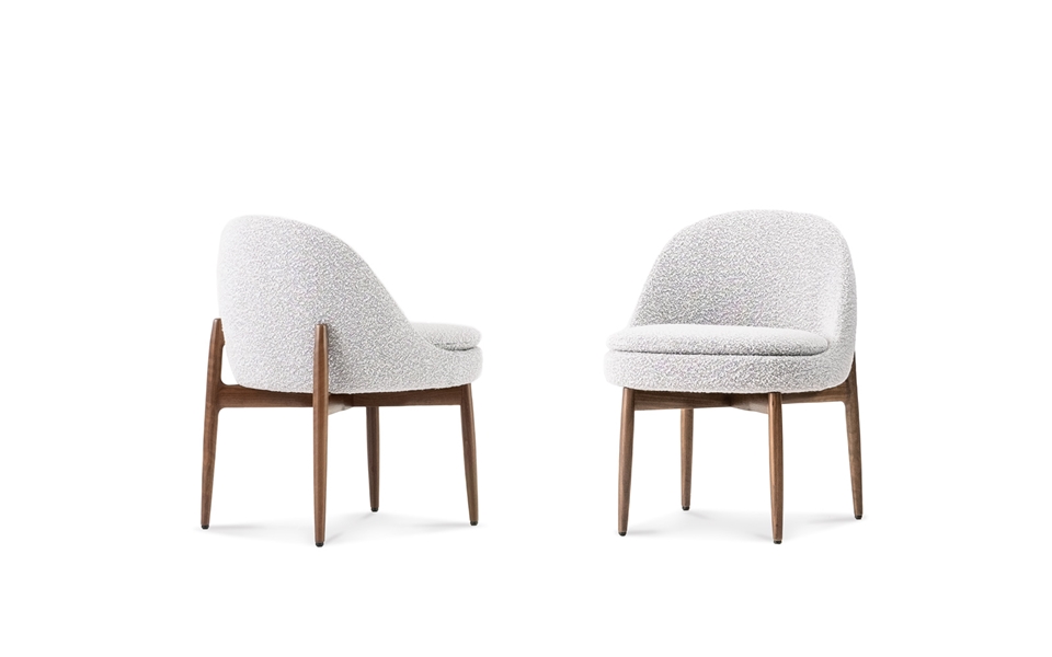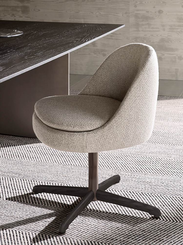 In its fixed version, it stands on slender legs in solid wood or metal with tips, which elevate the enveloping padded shell, creating a subtle rhythm of vertical lines. Instead, the swivel version, has a 360° return mechanism and rests on a metal base with solid wood spokes.