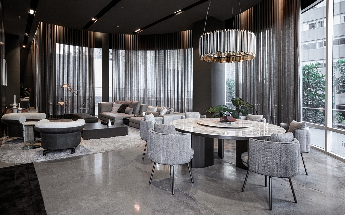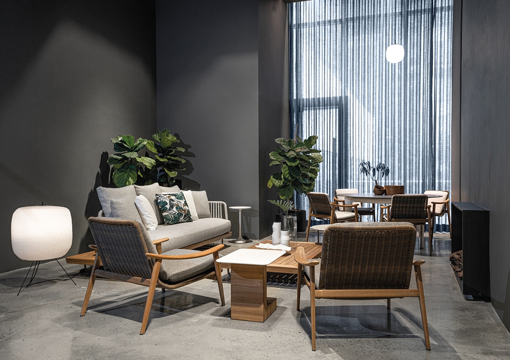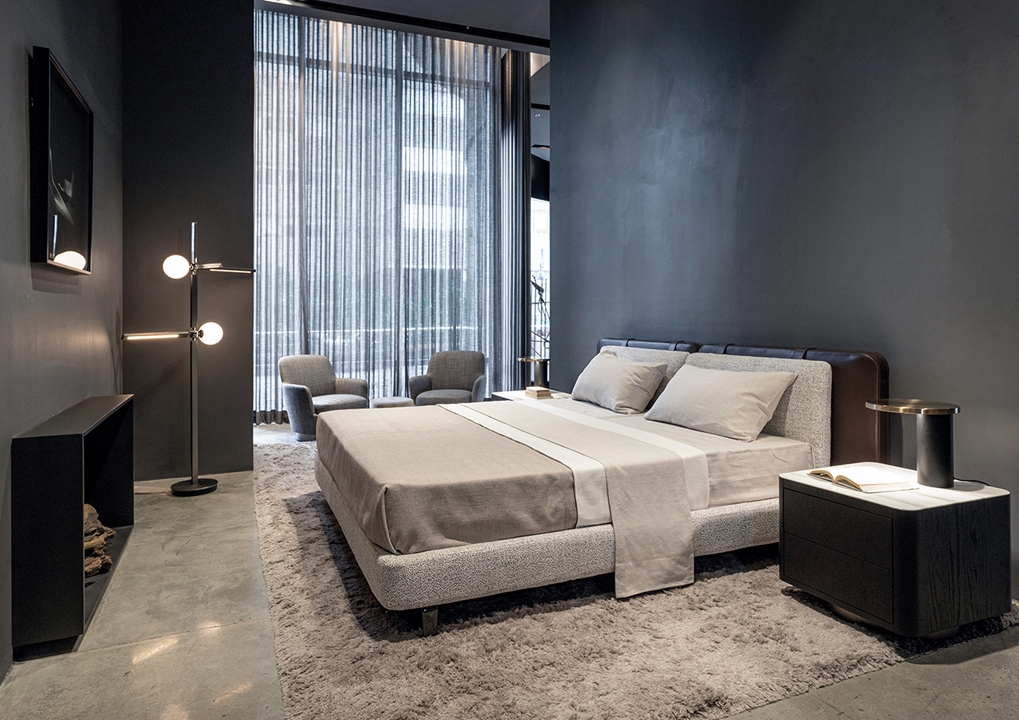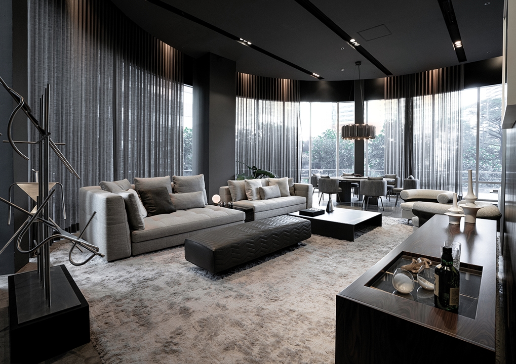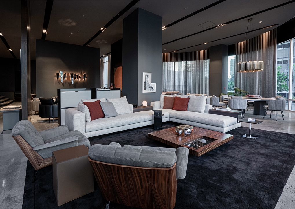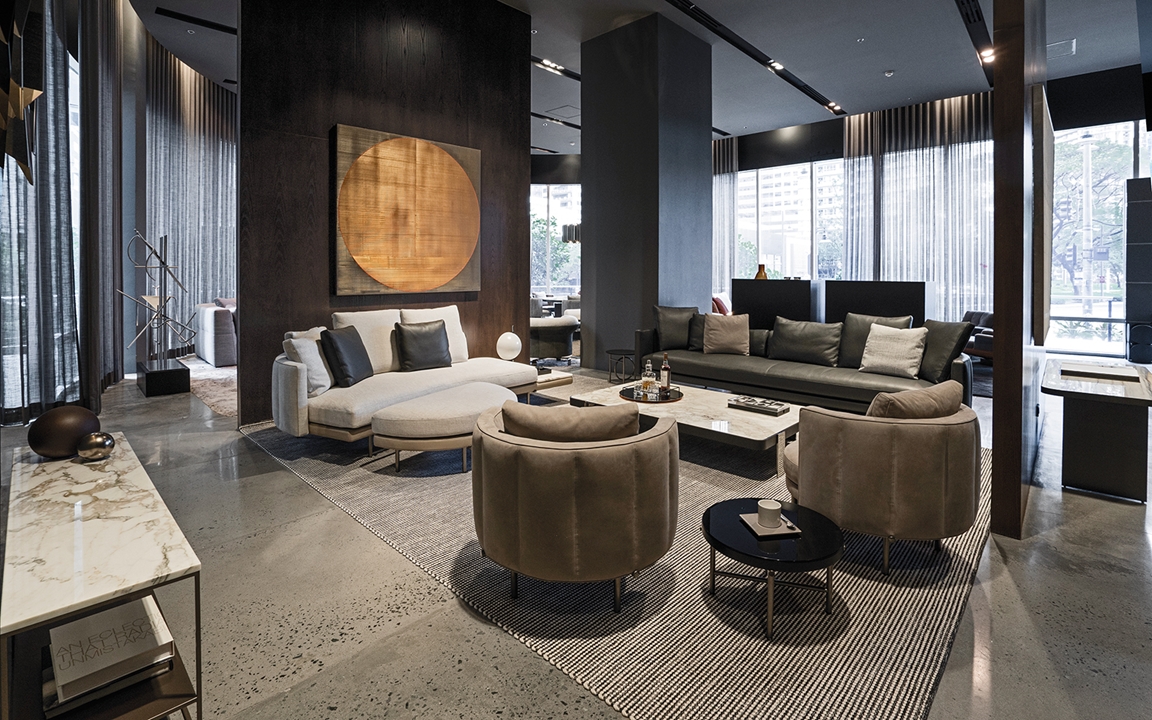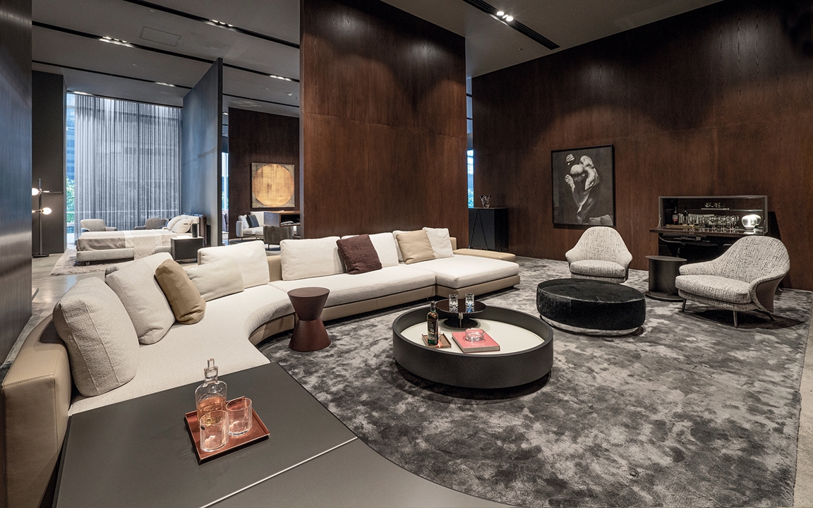 Stylish, welcoming settings, warmed by chestnut wood panelling that alternate with walls painted in a warm shade of grey, host the 2020 Collection at the Minotti Manila by Living Innovations flagship store.