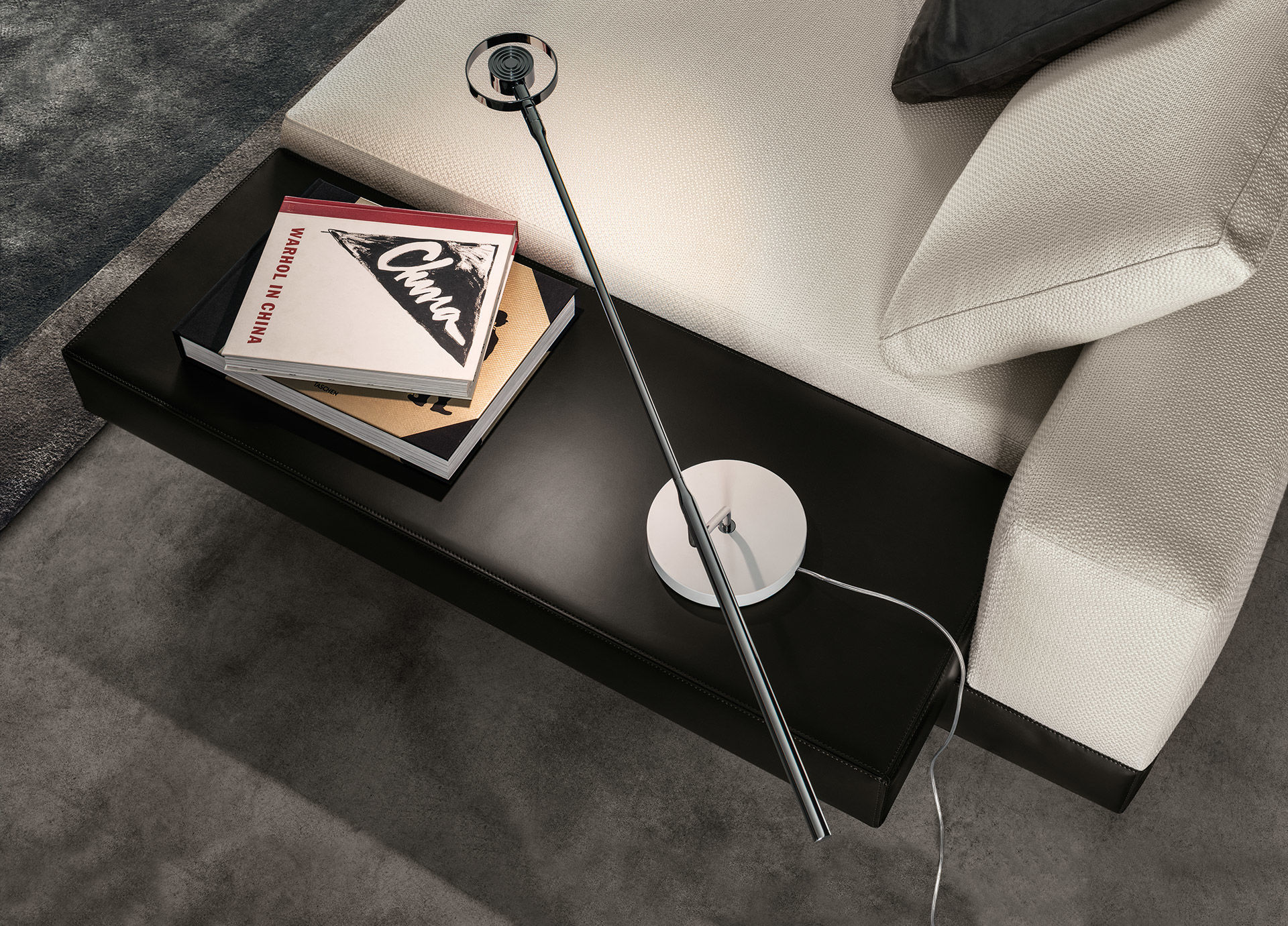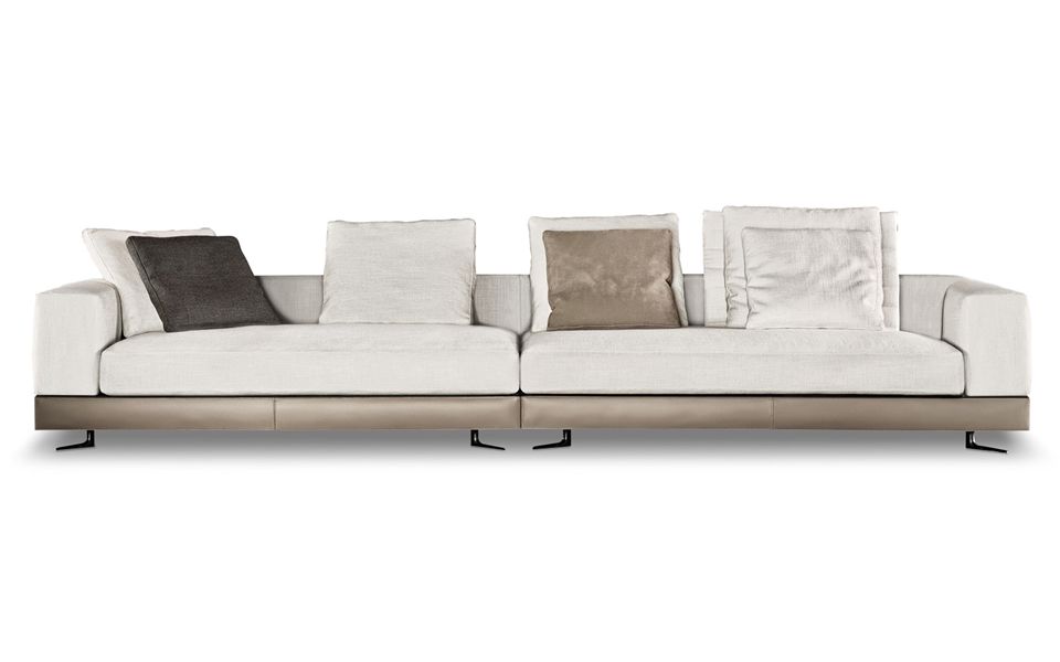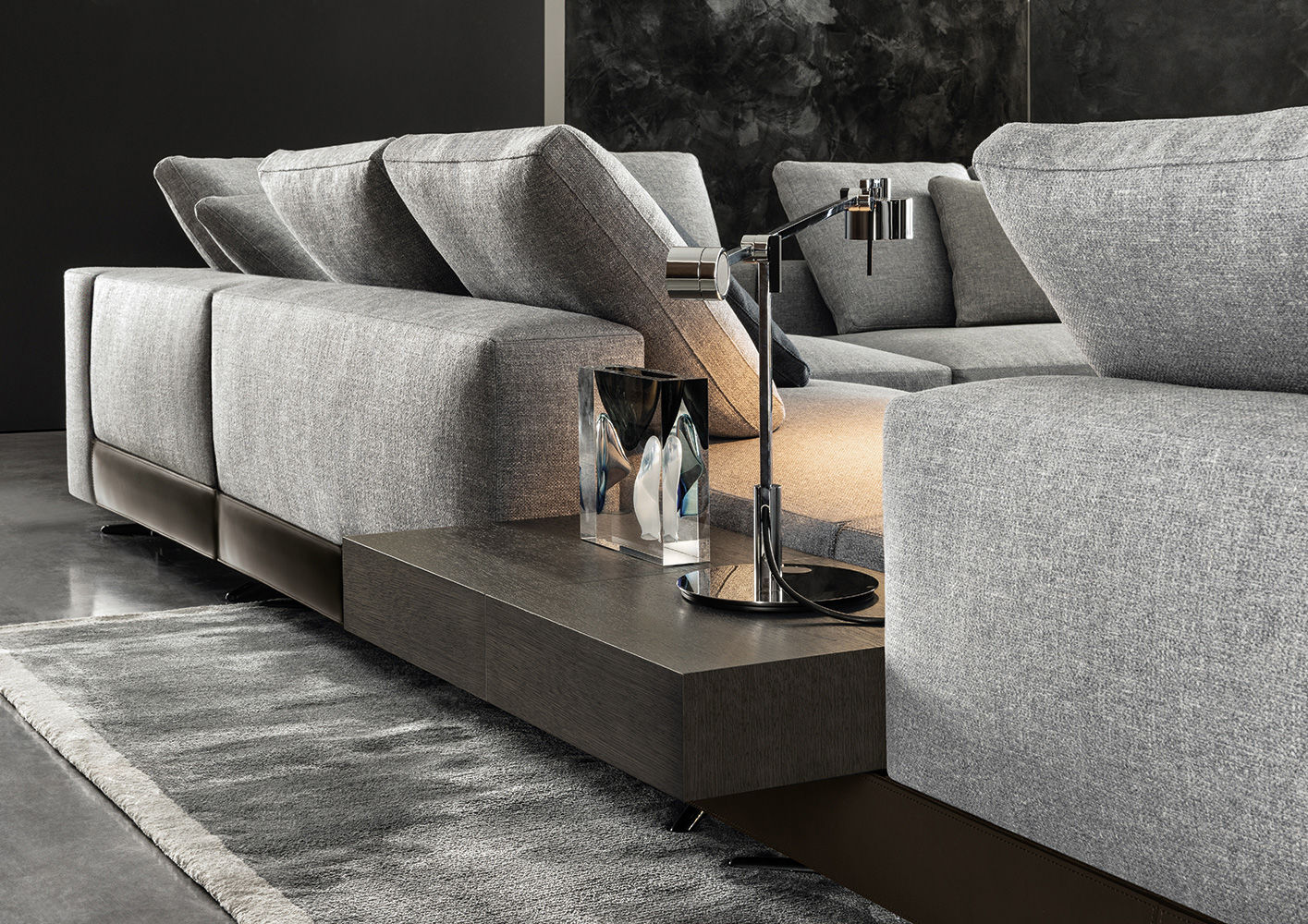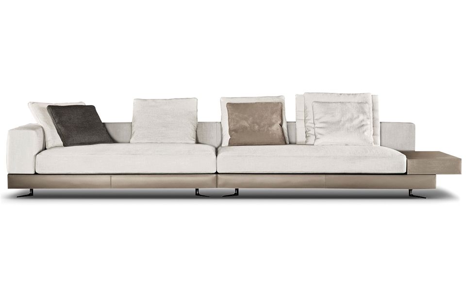 The sofa base can be upholstered in fabric, leather or saddle-hide upon which the seat backs, cushions and tray tops are placed to create a captivating interplay of shapes and alternating positive and negative spaces. The sofa sits on die-cast aluminum Pewter-colored feet, an exclusive design by Minotti Studio, that are set at a 45° angle to the sofa corners, lending added flair, even to larger-sized compositions. To make the White sofa even more welcoming, the padding in the cushions was enhanced with a deeper layer of goose down, making them luxuriously soft and creating a pleasant contrast to the sleek formality of the sofa base.