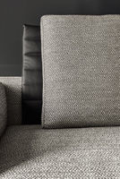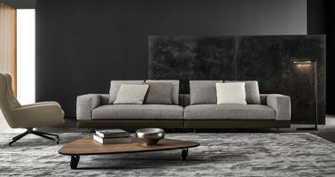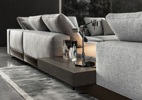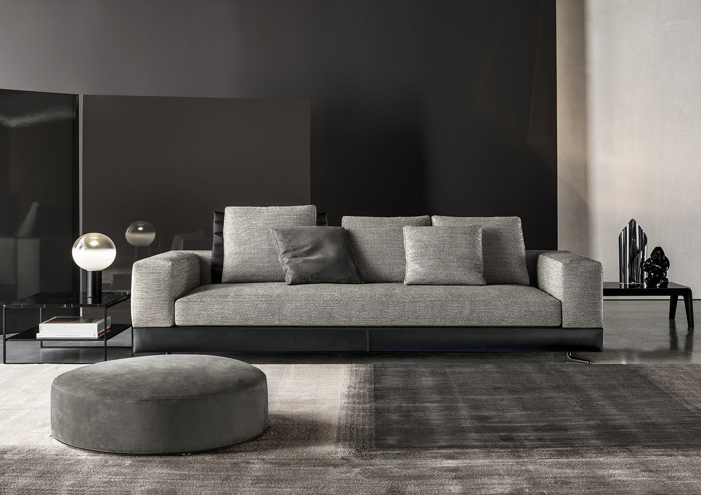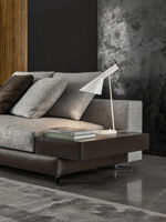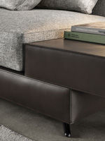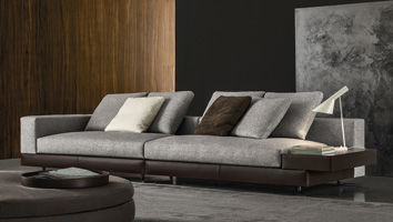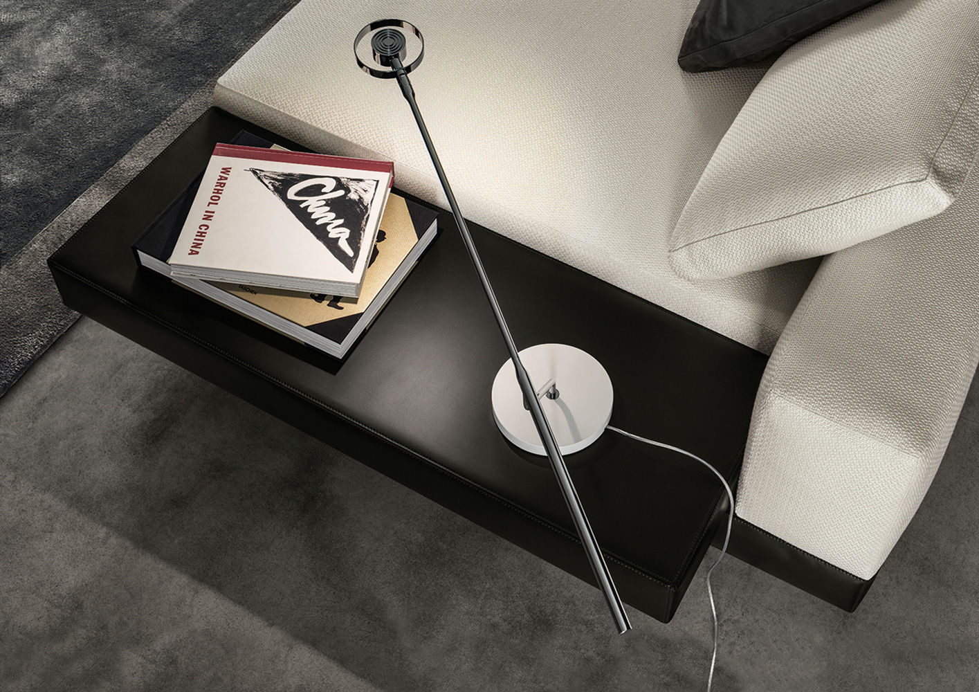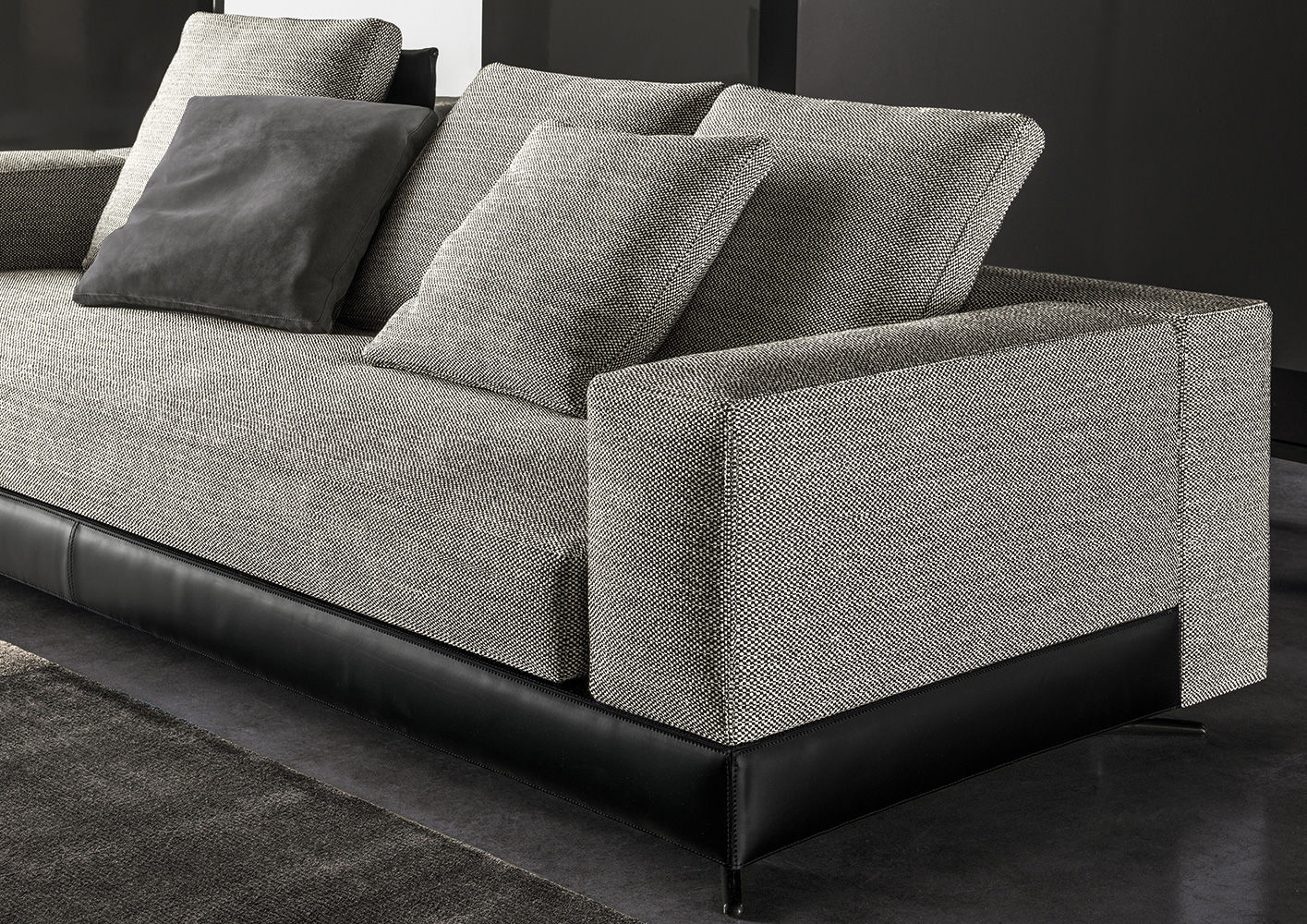 The sofa base can be upholstered in fabric, leather or saddle-hide upon which the seat backs, cushions and tray tops are placed to create a captivating interplay of shapes and alternating positive and negative spaces. The sofa sits on die-cast aluminum Pewter-colored feet, an exclusive design by Minotti Studio, that are set at a 45° angle to the sofa corners, lending added flair, even to larger-sized compositions. To make the White sofa even more welcoming, the padding in the cushions was enhanced with a deeper layer of goose down, making them luxuriously soft and creating a pleasant contrast to the sleek formality of the sofa base.